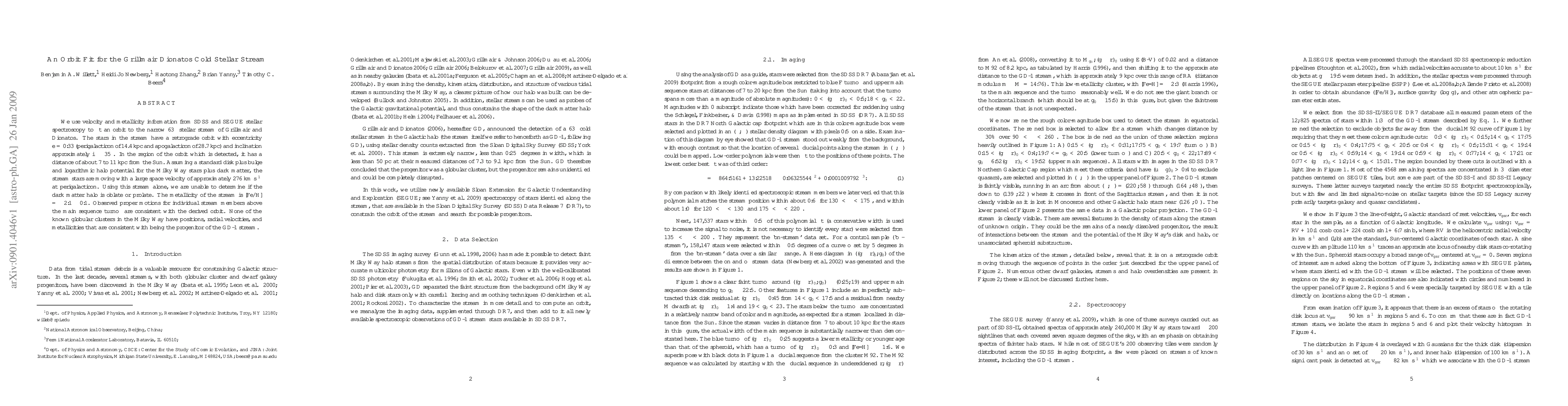 The research identifies a narrow stellar stream, Grillmair and Dionatos, with a retrograde orbit, eccentricity of 0.33, and a distance of 7-11 kpc from the Sun. The stream moves at a high space velocity of ~276 km/s at perigalacticon, but does not help determine the shape of the dark matter halo. Its metallicity is -2.1±0.1, and none of the known globular clusters are consistent with being its progenitor.