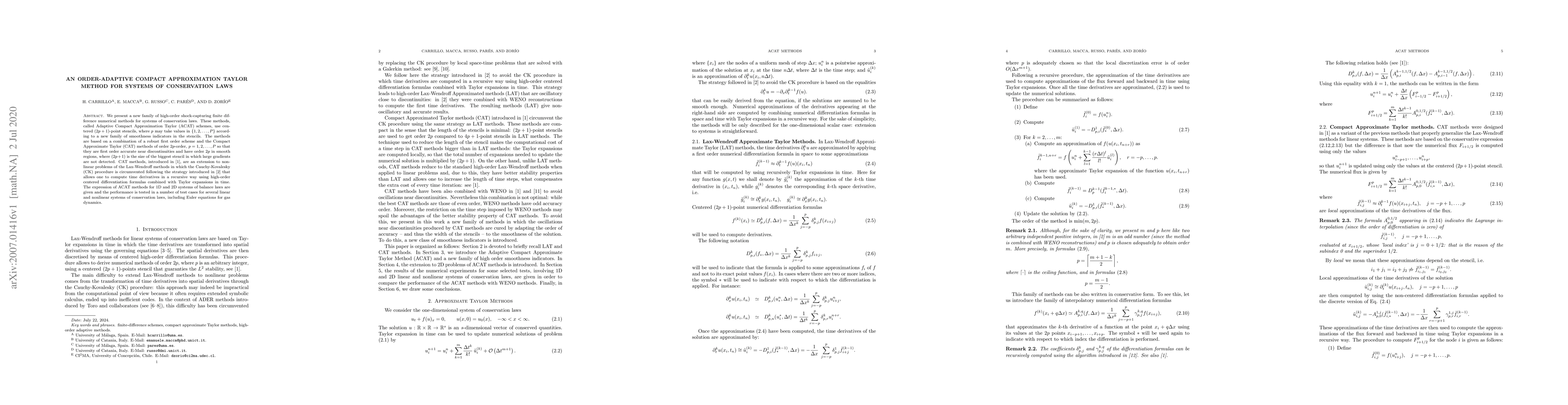 We present a new family of high-order shock-capturing finite difference numerical methods for systems of conservation laws. These methods, called Adaptive Compact Approximation Taylor (ACAT) schemes, use centered $(2p + 1)$-point stencils, where $p$ may take values in $\{1, 2, \dots, P\}$ according to a new family of smoothness indicators in the stencils. The methods are based on a combination of a robust first order scheme and the Compact Approximate Taylor (CAT) methods of order $2p$-order, $p=1,2,\dots, P$ so that they are first order accurate near discontinuities and have order $2p$ in smooth regions, where $(2p +1)$ is the size of the biggest stencil in which large gradients are not detected. CAT methods, introduced in \cite{CP2019}, are an extension to nonlinear problems of the Lax-Wendroff methods in which the Cauchy-Kovalesky (CK) procedure is circumvented following the strategy introduced in \cite{ZBM2017} that allows one to compute time derivatives in a recursive way using high-order centered differentiation formulas combined with Taylor expansions in time. The expression of ACAT methods for 1D and 2D systems of balance laws are given and the performance is tested in a number of test cases for several linear and nonlinear systems of conservation laws, including Euler equations for gas dynamics.