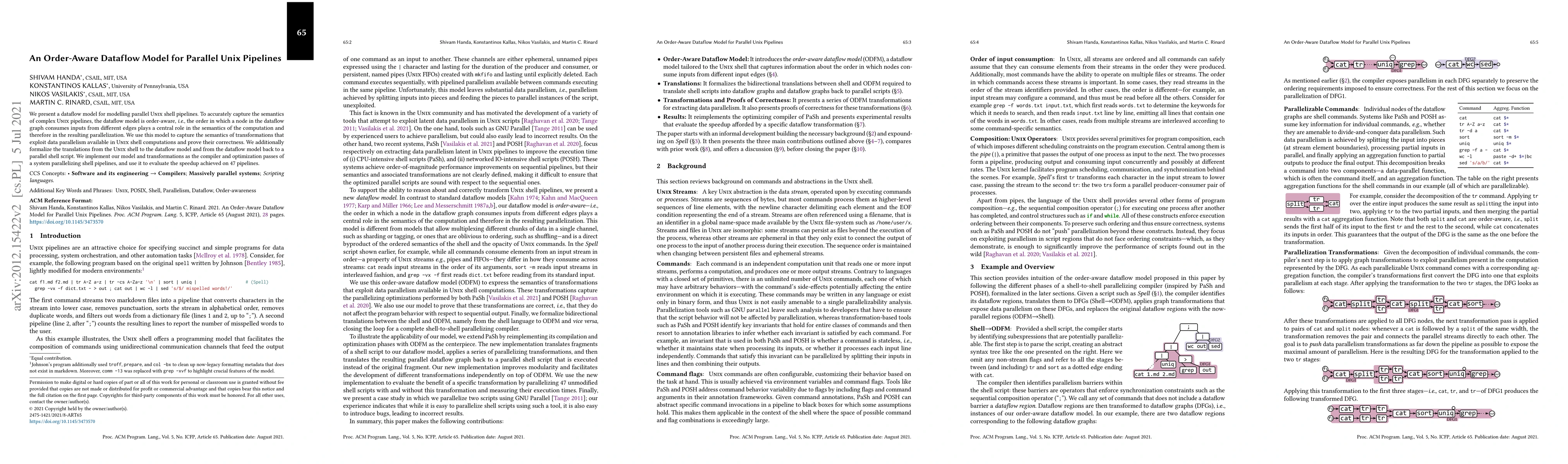 This paper introduces an order-aware dataflow model for parallelizing Unix shell pipelines, capturing the semantics of complex computations and enabling data parallelism. The model is implemented as a compiler system, demonstrating significant speedups on parallelized pipelines.