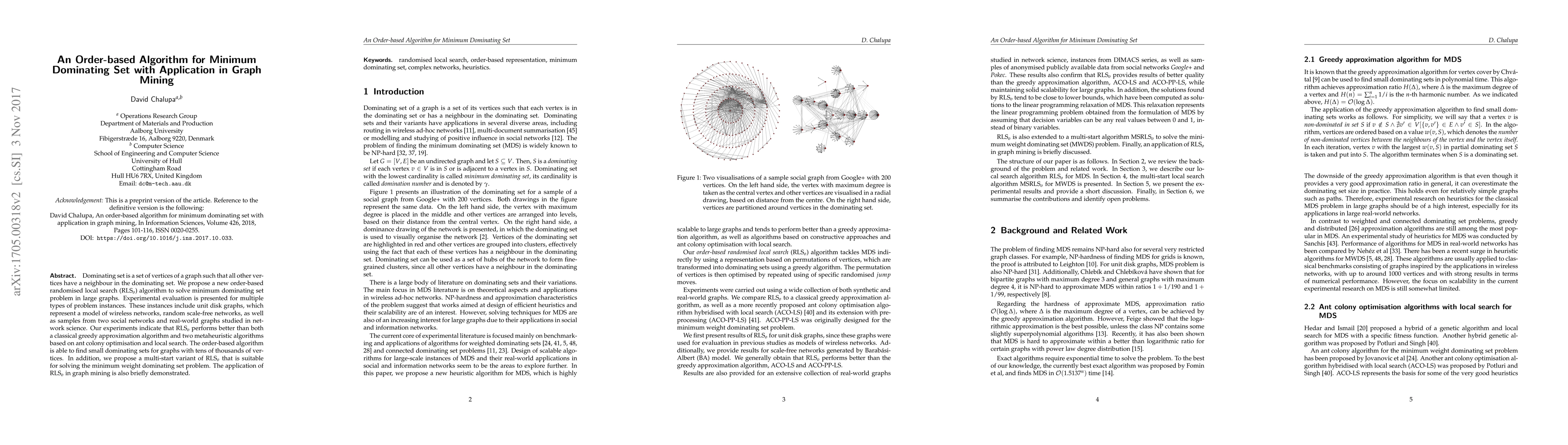 This paper introduces an order-based randomised local search algorithm (RLS$_o$) for solving the minimum dominating set problem in large graphs, showing superior performance over classical and metaheuristic methods through extensive experiments on various graph types. The algorithm is demonstrated to efficiently find small dominating sets and applied in graph mining.