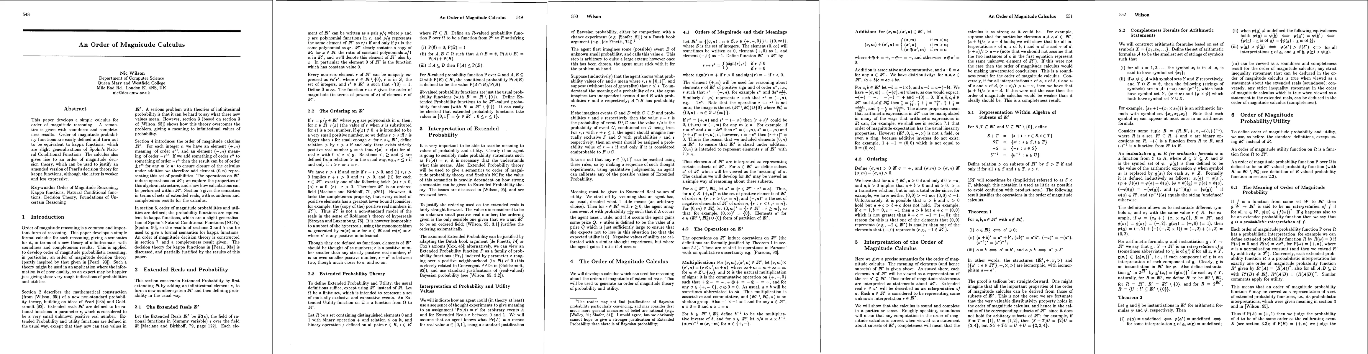 This paper develops a simple calculus for order of magnitude reasoning. A semantics is given with soundness and completeness results. Order of magnitude probability functions are easily defined and turn out to be equivalent to kappa functions, which are slight generalizations of Spohn's Natural Conditional Functions. The calculus also gives rise to an order of magnitude decision theory, which can be used to justify an amended version of Pearl's decision theory for kappa functions, although the latter is weaker and less expressive.