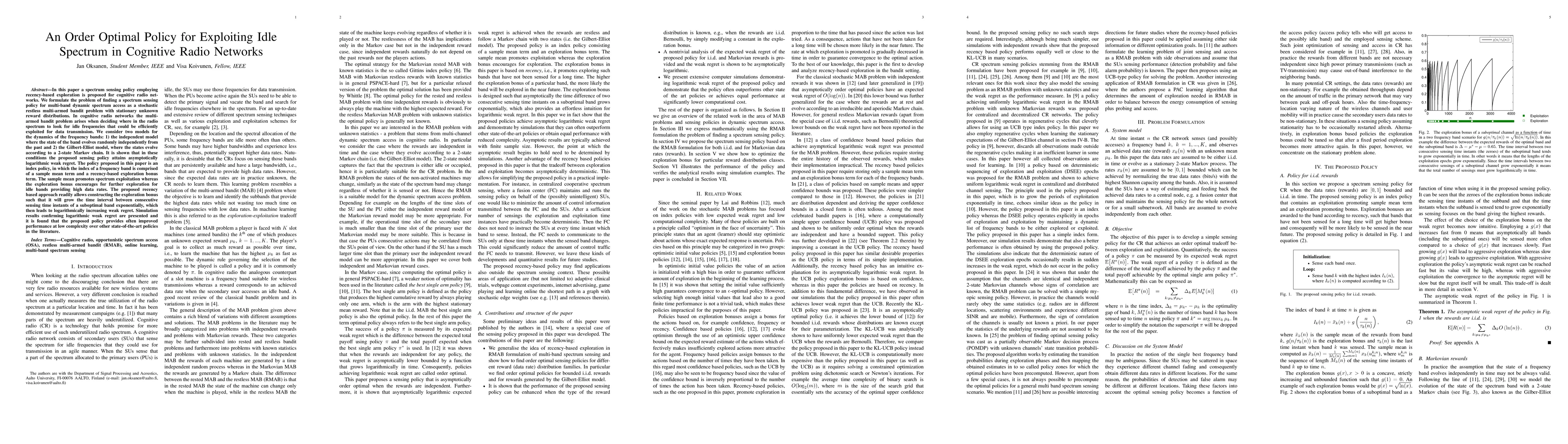 This paper proposes a recency-based exploration policy for cognitive radio networks to exploit idle spectrum efficiently. The policy is formulated as a stochastic restless multi-armed bandit problem and achieves asymptotically logarithmic weak regret under two dynamic band models. The proposed index policy balances spectrum exploitation and exploration, demonstrating improved performance over other methods with low complexity.