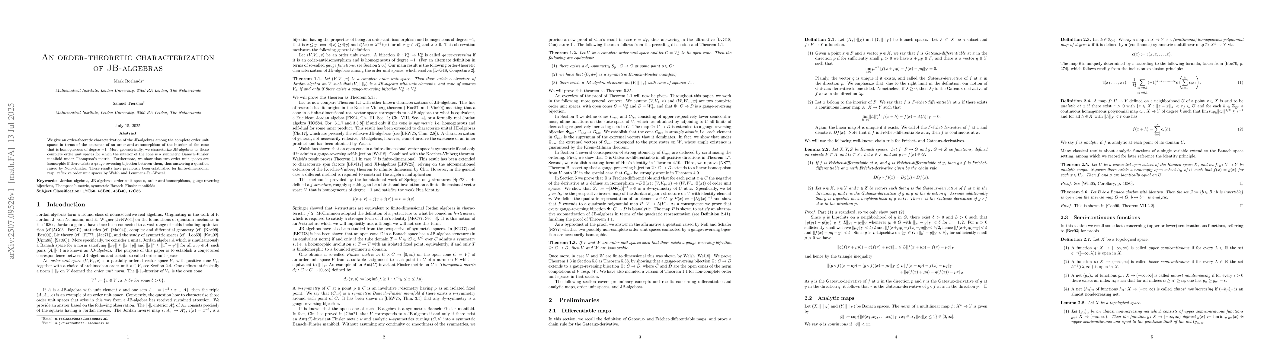 We give an order-theoretic characterization of the JB-algebras among the complete order unit spaces in terms of the existence of an order-anti-automorphism of the interior of the cone that is homogeneous of degree -1. More geometrically, we characterize JB-algebras as those complete order unit spaces for which the interior of the cone is a symmetric Banach--Finsler manifold under Thompson's metric. Furthermore, we show that two order unit spaces are isomorphic if there exists a gauge-reversing bijection between them, thus answering a question raised by Noll--Sch\"afer. These results have previously been established for finite-dimensional resp. reflexive order unit spaces by Walsh and Lemmens--R.--Wortel.