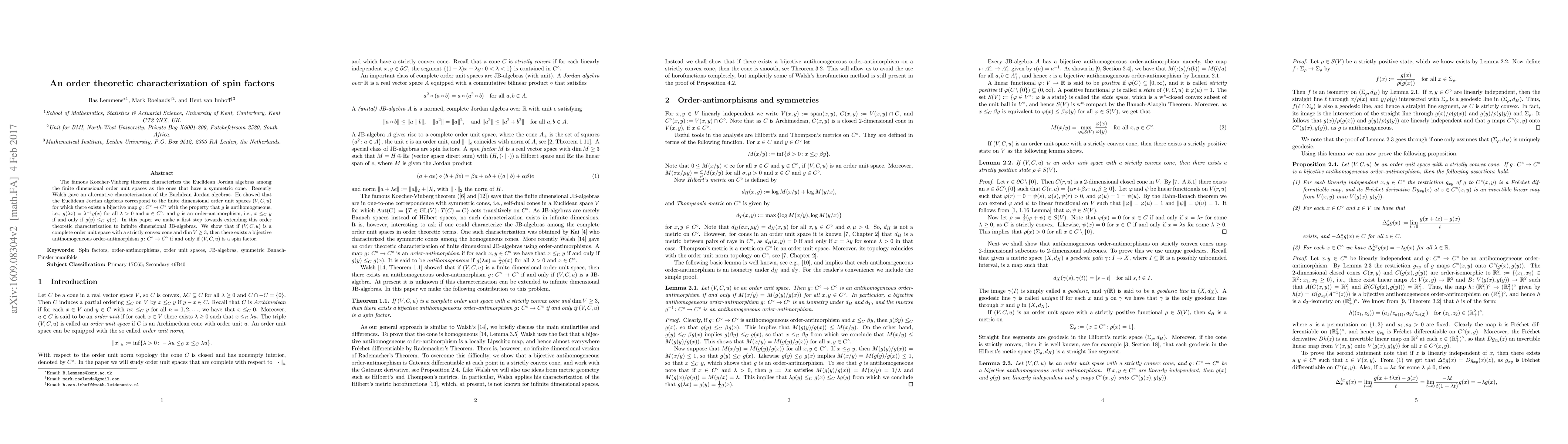 The famous Koecher-Vinberg theorem characterizes the Euclidean Jordan algebras among the finite dimensional order unit spaces as the ones that have a symmetric cone. Recently Walsh gave an alternative characterization of the Euclidean Jordan algebras. He showed that the Euclidean Jordan algebras correspond to the finite dimensional order unit spaces $(V,C,u)$ for which there exists a bijective map $g\colon C^\circ\to C^\circ$ with the property that $g$ is antihomogeneous, i.e., $g(\lambda x) =\lambda^{-1}g(x)$ for all $\lambda>0$ and $x\in C^\circ$, and $g$ is an order-antimorphism, i.e., $x\leq_C y$ if and only if $g(y)\leq_C g(x)$. In this paper we make a first step towards extending this order theoretic characterization to infinite dimensional JB-algebras. We show that if $(V,C,u)$ is a complete order unit space with a strictly convex cone and $\dim V\geq 3$, then there exists a bijective antihomogeneous order-antimorphism $g\colon C^\circ\to C^\circ$ if and only if $(V,C,u)$ is a spin factor.