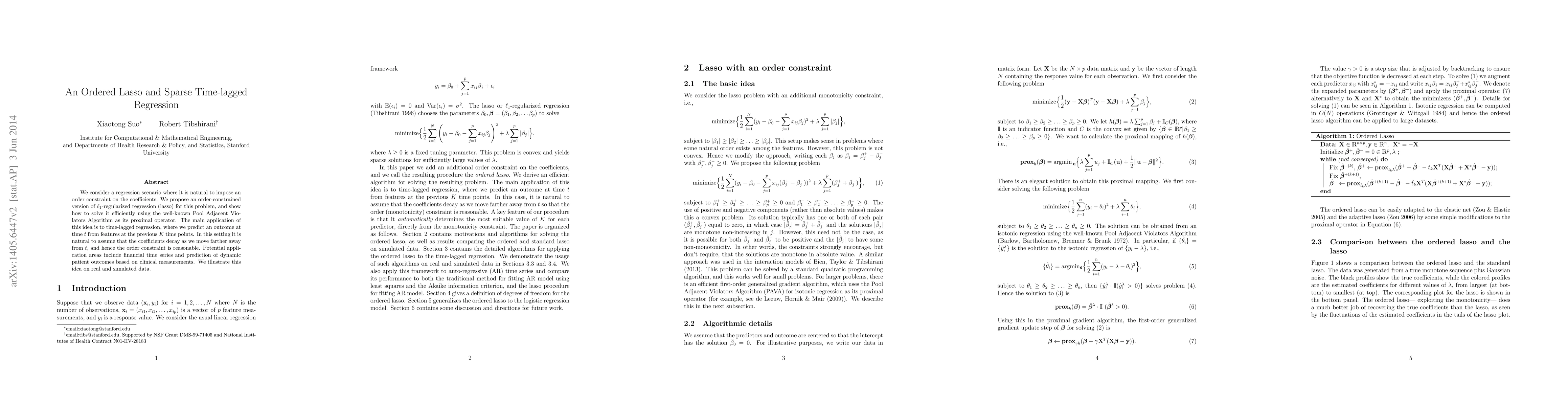 This paper proposes an ordered Lasso method for time-lagged regression, enforcing a natural order constraint on coefficients to reflect decay over time. It utilizes the Pool Adjacent Violators Algorithm for efficient solution, demonstrating potential applications in financial time series and dynamic patient outcome predictions.
