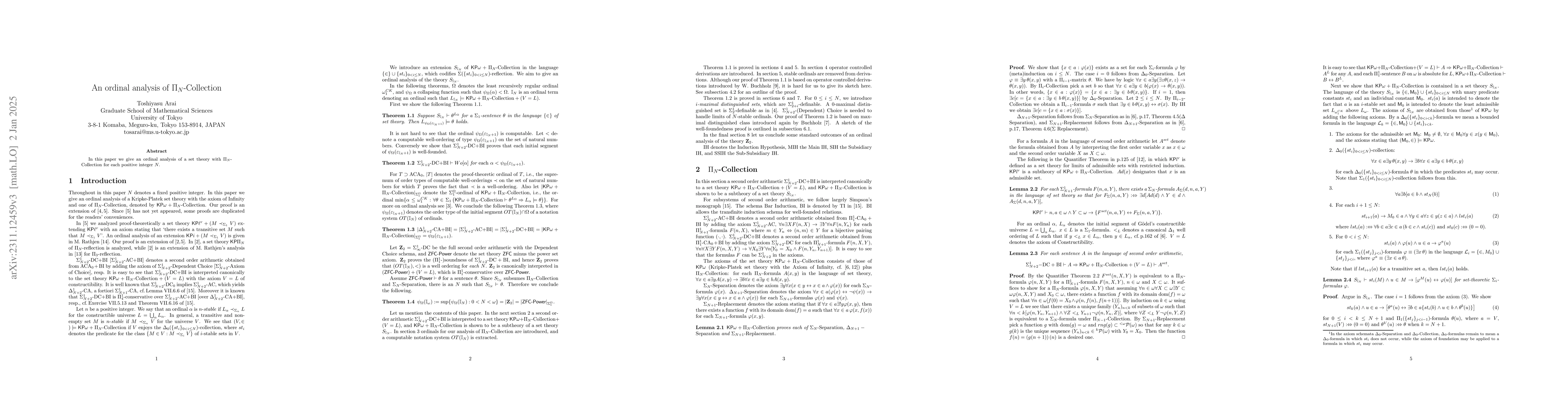 This paper provides an ordinal analysis of a set theory incorporating the $\Pi_{N}$-Collection axiom, aiming to determine its proof-theoretic strength and compare it to other established systems. The analysis reveals the set theory's relative consistency and complexity within the broader framework of mathematical logic.