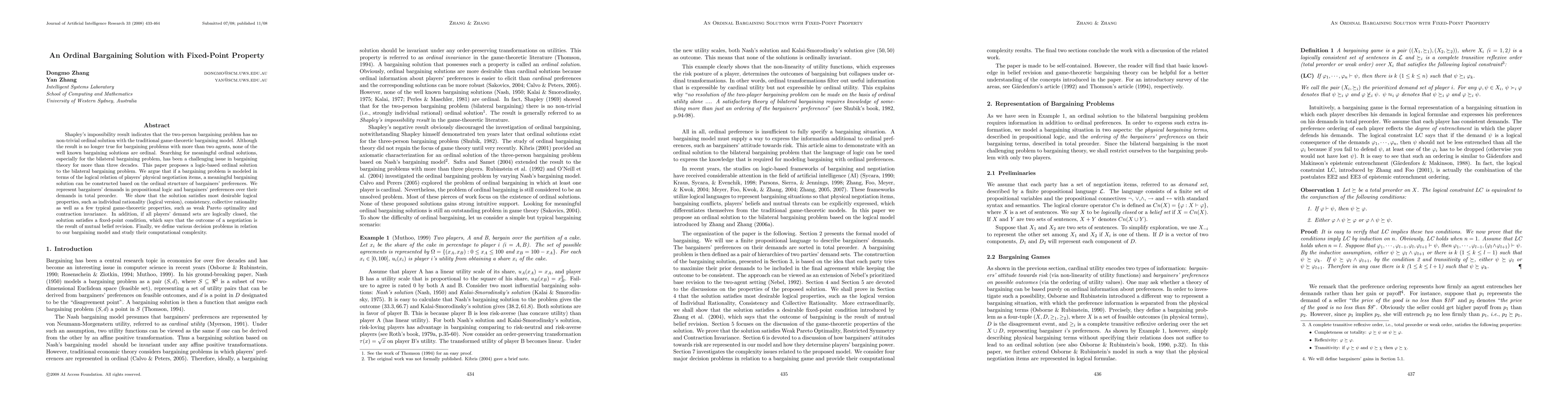 This paper proposes a logic-based ordinal solution for the bilateral bargaining problem, representing demands in propositional logic and preferences in total preorder. The solution satisfies logical properties like individual rationality, consistency, and collective rationality, and a fixed-point condition if players' demand sets are logically closed.
