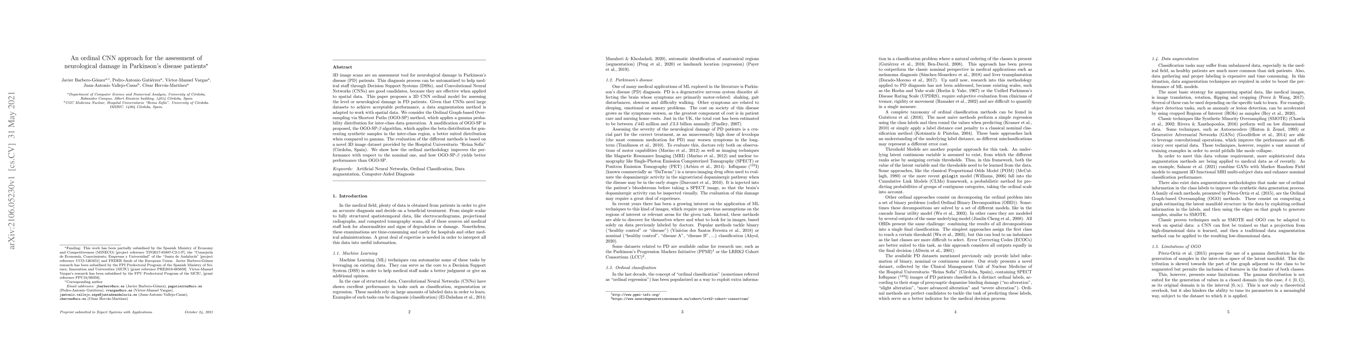 3D image scans are an assessment tool for neurological damage in Parkinson's disease (PD) patients. This diagnosis process can be automatized to help medical staff through Decision Support Systems (DSSs), and Convolutional Neural Networks (CNNs) are good candidates, because they are effective when applied to spatial data. This paper proposes a 3D CNN ordinal model for assessing the level or neurological damage in PD patients. Given that CNNs need large datasets to achieve acceptable performance, a data augmentation method is adapted to work with spatial data. We consider the Ordinal Graph-based Oversampling via Shortest Paths (OGO-SP) method, which applies a gamma probability distribution for inter-class data generation. A modification of OGO-SP is proposed, the OGO-SP-$\beta$ algorithm, which applies the beta distribution for generating synthetic samples in the inter-class region, a better suited distribution when compared to gamma. The evaluation of the different methods is based on a novel 3D image dataset provided by the Hospital Universitario 'Reina Sof\'ia' (C\'ordoba, Spain). We show how the ordinal methodology improves the performance with respect to the nominal one, and how OGO-SP-$\beta$ yields better performance than OGO-SP.