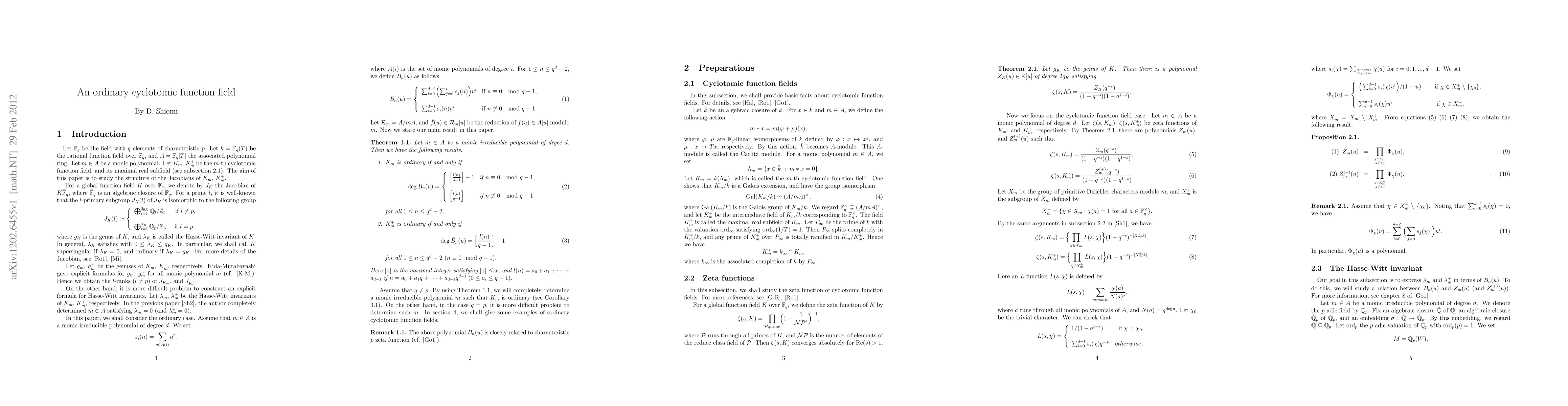 In this paper, we investigate the $p$-rank of Jacobian of cyclotomic function field $K_m$. Our goal in this paper is to give the necessary and sufficient condition $m$ such that $K_m$ is ordinary.