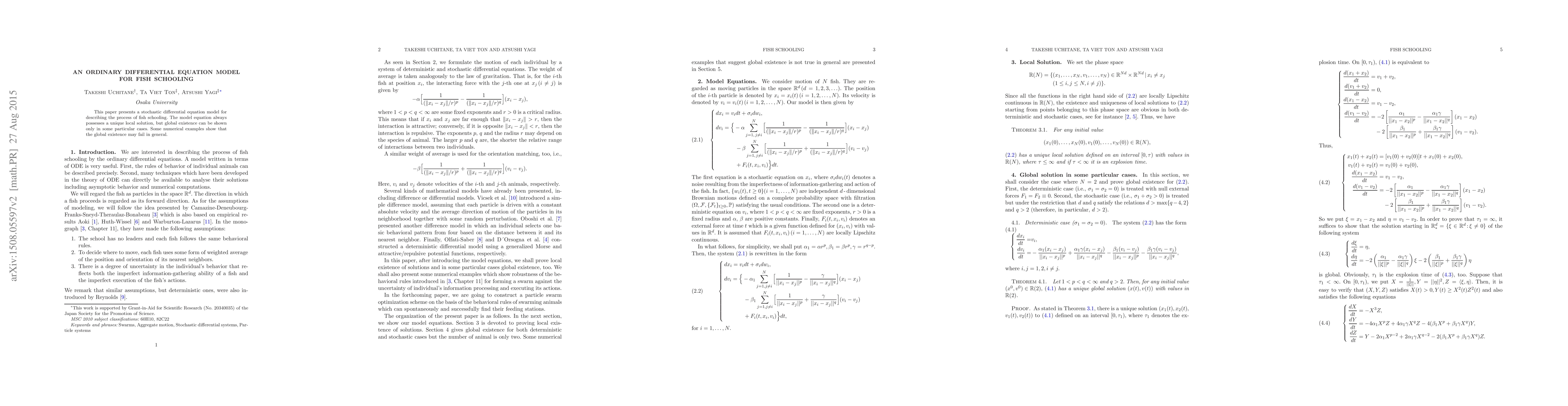 This paper introduces a stochastic differential equation model to describe fish schooling behavior, ensuring a unique local solution but only proving global existence in specific scenarios, with numerical examples indicating global existence may not always hold.