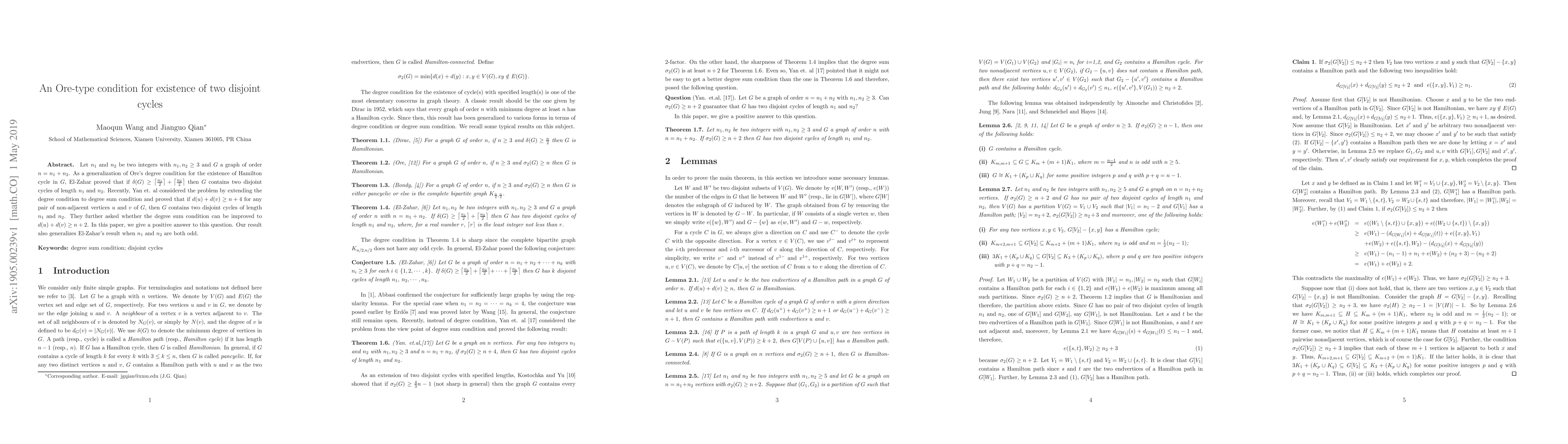 Let $n_{1}$ and $n_{2}$ be two integers with $n_{1},n_{2}\geq3$ and $G$ a graph of order $n=n_{1}+n_{2}$. As a generalization of Ore's degree condition for the existence of Hamilton cycle in $G$, El-Zahar proved that if $\delta(G)\geq \left\lceil\frac{n_{1}}{2}\right\rceil+\left\lceil\frac{n_{2}}{2}\right\rceil$ then $G$ contains two disjoint cycles of length $n_{1}$ and $n_{2}$. Recently, Yan et. al considered the problem by extending the degree condition to degree sum condition and proved that if $d(u)+d(v)\geq n+4$ for any pair of non-adjacent vertices $u$ and $v$ of $G$, then $G$ contains two disjoint cycles of length $n_{1}$ and $n_{2}$. They further asked whether the degree sum condition can be improved to $d(u)+d(v)\geq n+2$. In this paper, we give a positive answer to this question. Our result also generalizes El-Zahar's result when $n_{1}$ and $n_{2}$ are both odd.
