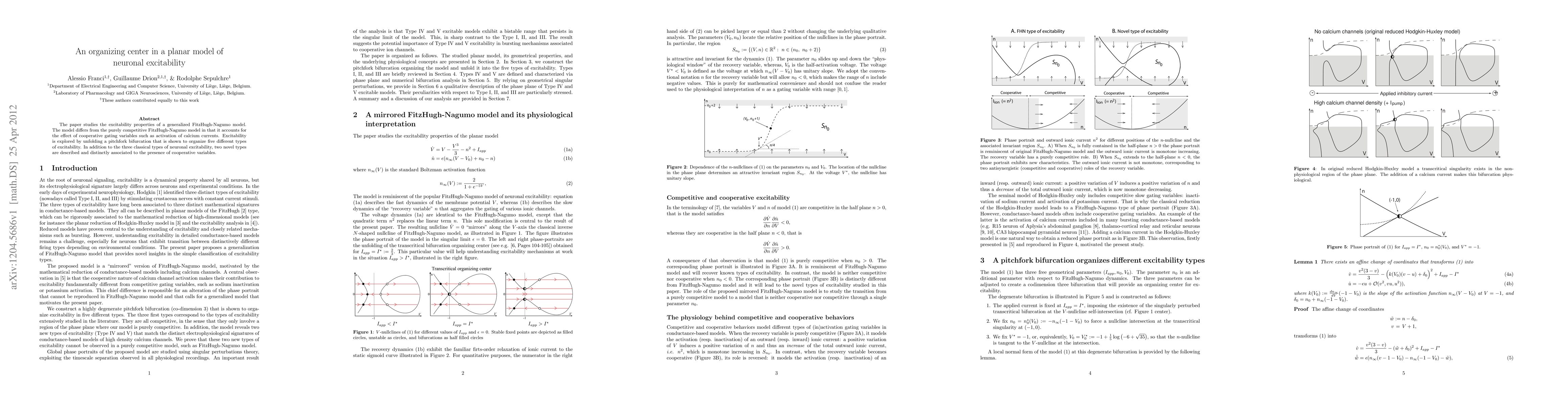 The paper studies the excitability properties of a generalized FitzHugh-Nagumo model. The model differs from the purely competitive FitzHugh-Nagumo model in that it accounts for the effect of cooperative gating variables such as activation of calcium currents. Excitability is explored by unfolding a pitchfork bifurcation that is shown to organize five different types of excitability. In addition to the three classical types of neuronal excitability, two novel types are described and distinctly associated to the presence of cooperative variables.