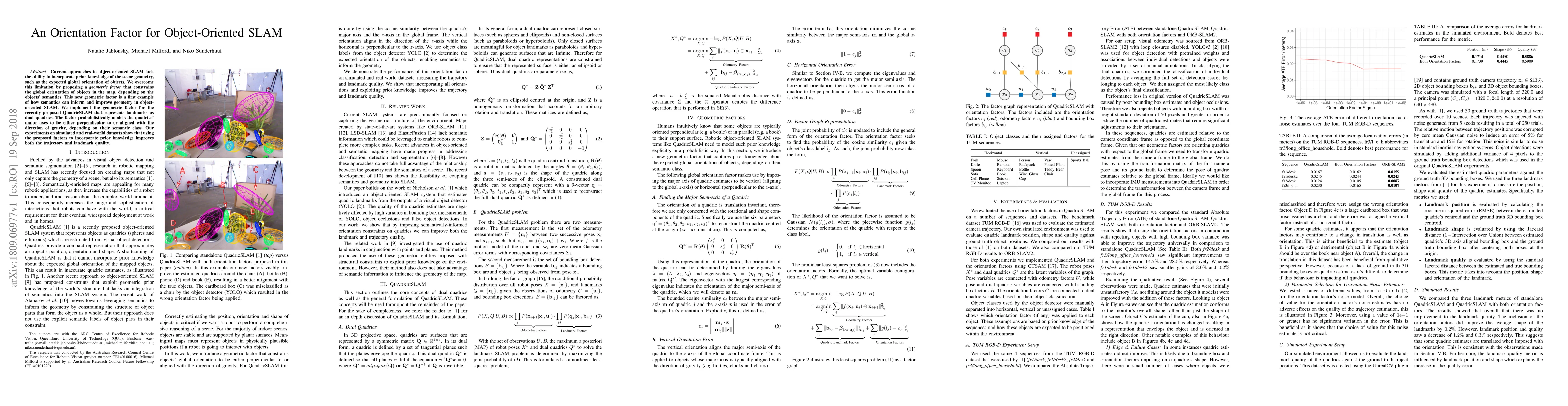 The paper proposes a geometric factor for object-oriented SLAM that constrains the global orientation of objects based on their semantic class, using dual quadrics represented in QuadricSLAM. It incorporates prior knowledge of scene geometry, specifically the expected global orientation of objects, to improve trajectory and landmark quality.