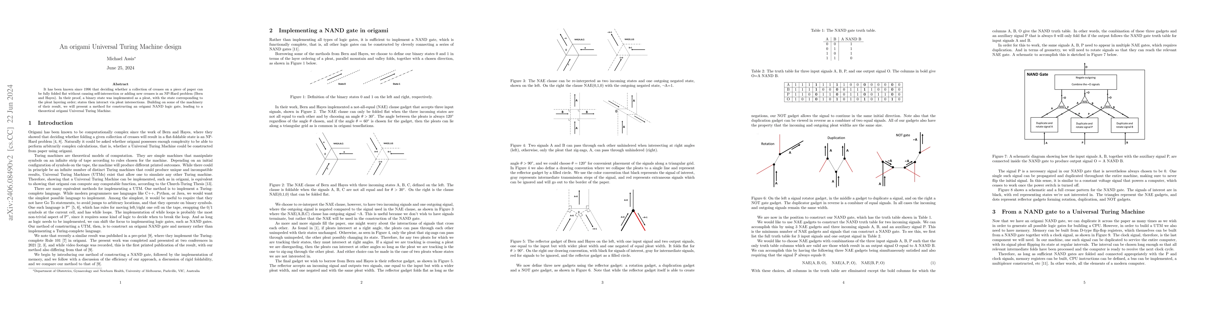 It has been known since 1996 that deciding whether a collection of creases on a piece of paper can be fully folded flat without causing self-intersection or adding new creases is an NP-Hard problem (Bern and Hayes). In their proof, a binary state was implemented as a pleat, with the state corresponding to the pleat layering order; states then interact via pleat intersections. Building on some of the machinery of their result, we will present a method for constructing an origami NAND logic gate, leading to a theoretical origami Universal Turing Machine.