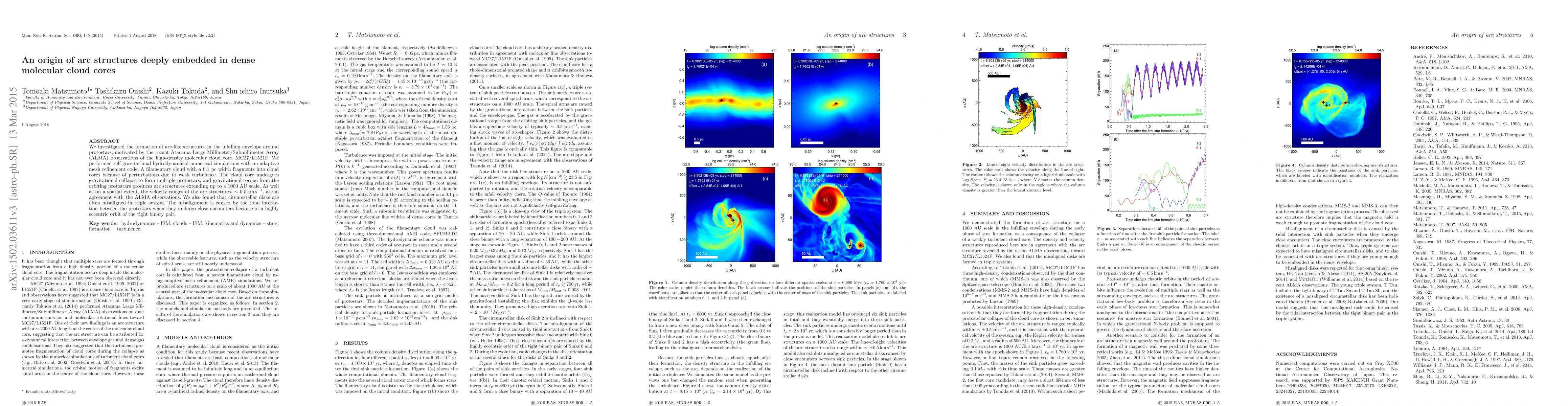 We investigated the formation of arc-like structures in the infalling envelope around protostars, motivated by the recent Atacama Large Millimeter/Submillimeter Array (ALMA) observations of the high-density molecular cloud core, MC27/L1521F. We performed self-gravitational hydrodynamical numerical simulations with an adaptive mesh refinement code. A filamentary cloud with a 0.1~pc width fragments into cloud cores because of perturbations due to weak turbulence. The cloud core undergoes gravitational collapse to form multiple protostars, and gravitational torque from the orbiting protostars produces arc structures extending up to a 1000~AU scale. As well as on a spatial extent, the velocity ranges of the arc structures, $\sim0.5\,\mathrm{km\,s}^{-1}$, are in agreement with the ALMA observations. We also found that circumstellar disks are often misaligned in triple system. The misalignment is caused by the tidal interaction between the protostars when they undergo close encounters because of a highly eccentric orbit of the tight binary pair.