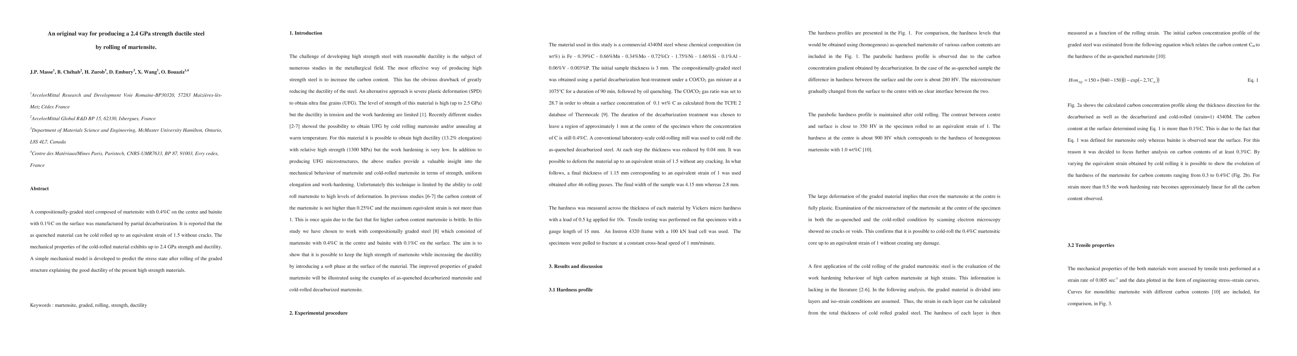 A compositionally-graded steel composed of martensite with 0.4%C on the centre and bainite with 0.1%C on the surface was manufactured by partial decarburization. It is reported that the as quenched material can be cold rolled up to an equivalent strain of 1.5 without cracks. The mechanical properties of the cold-rolled material exhibits up to 2.5 GPa strength and ductility. A simple mechanical model is developed to predict the stress state after rolling of the graded structure explaining the good ductility of the present high strength materials.