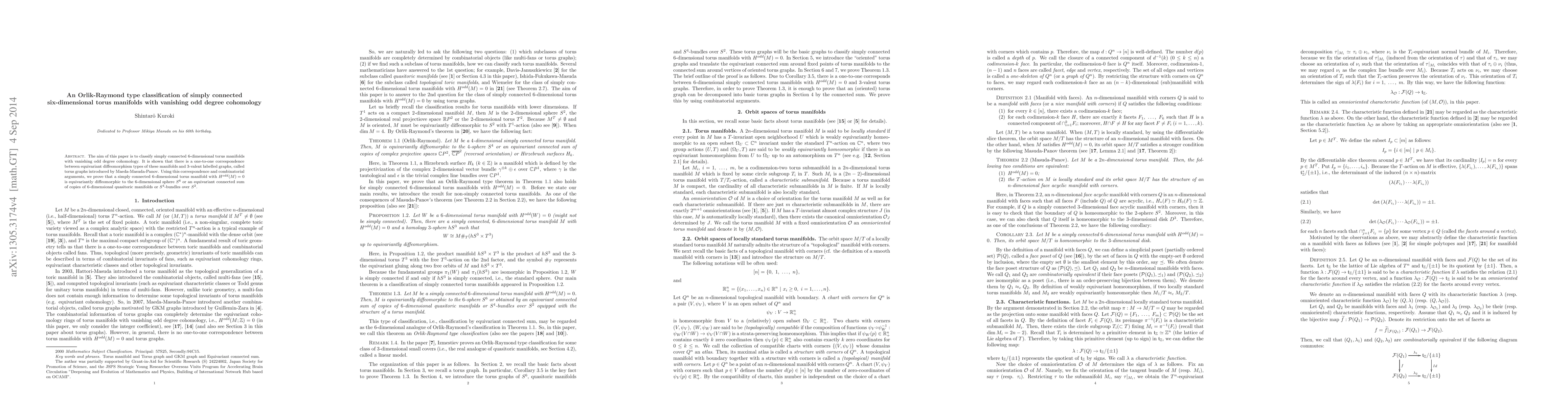 A classification system for 6-dimensional torus manifolds with vanishing odd degree cohomology is established, linking these manifolds to specific types of labelled graphs, allowing for a unique equivariant diffeomorphism classification.