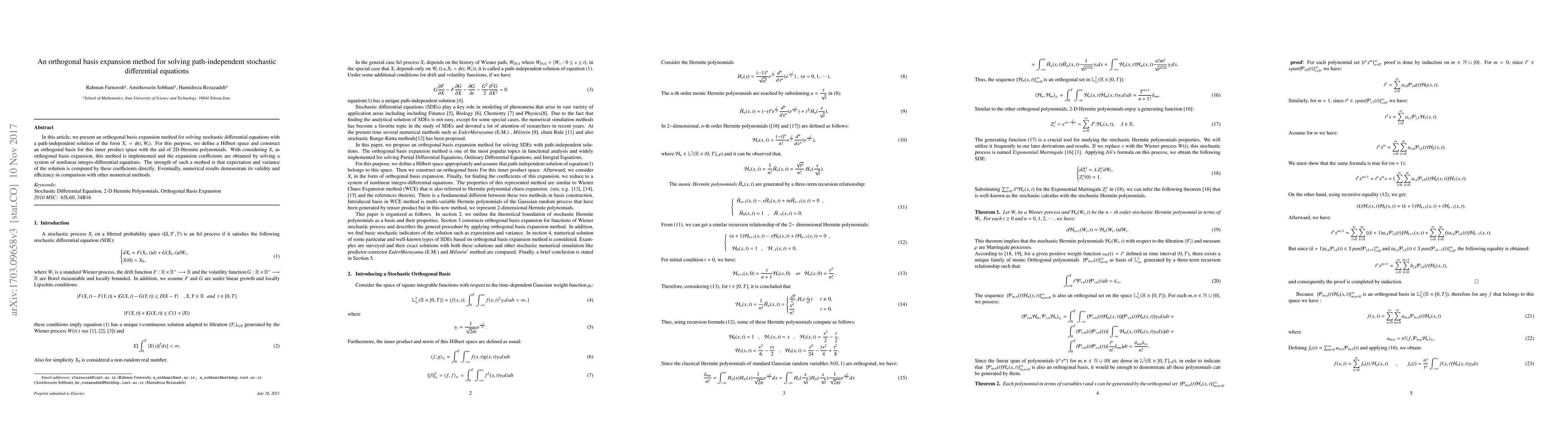 This paper introduces an orthogonal basis expansion method using 2D-Hermite polynomials to solve path-independent stochastic differential equations. The method computes the expectation and variance of the solution directly from expansion coefficients, and numerical results show its effectiveness compared to other methods.