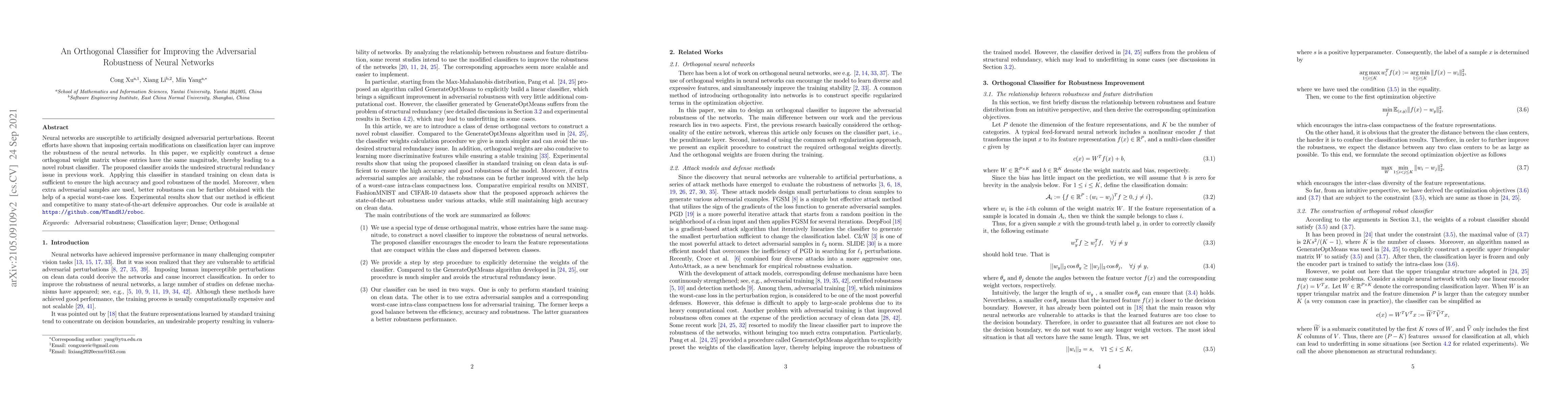 This paper proposes an orthogonal classifier using a dense orthogonal weight matrix to enhance the adversarial robustness of neural networks. The method avoids structural redundancy and achieves high accuracy and good robustness through standard training, with further improvements when adversarial samples are included.