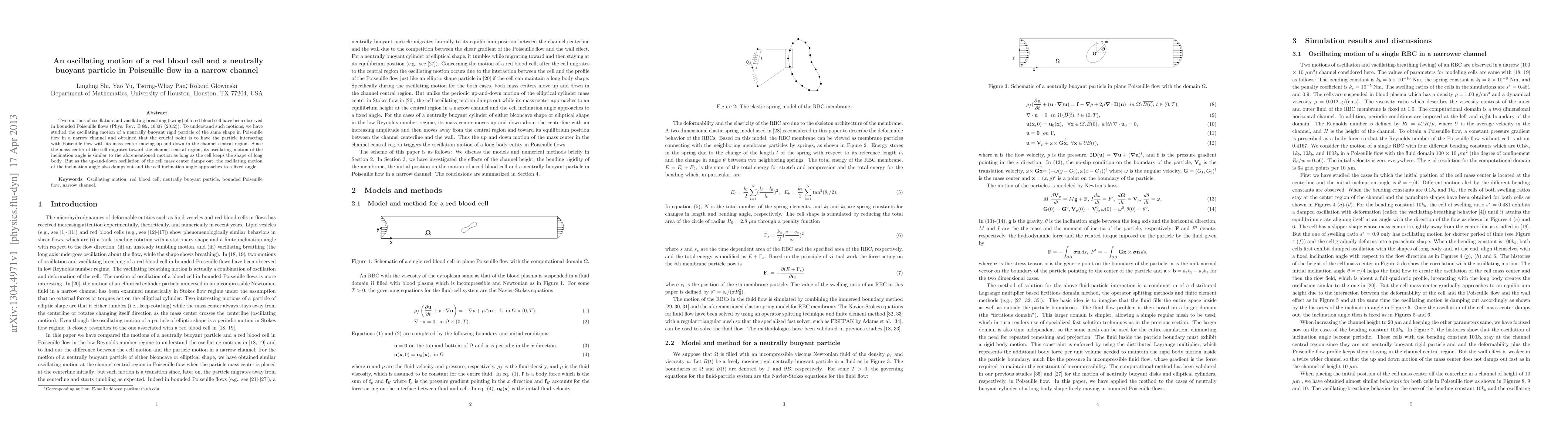 This paper investigates the oscillating motion of both red blood cells and neutrally buoyant rigid particles in Poiseuille flow within a narrow channel, finding that the key factor is the interaction of the particle's mass center with the flow. The study reveals that the red blood cell's oscillating inclination angle mirrors that of the particle as long as the cell maintains its elongated shape.