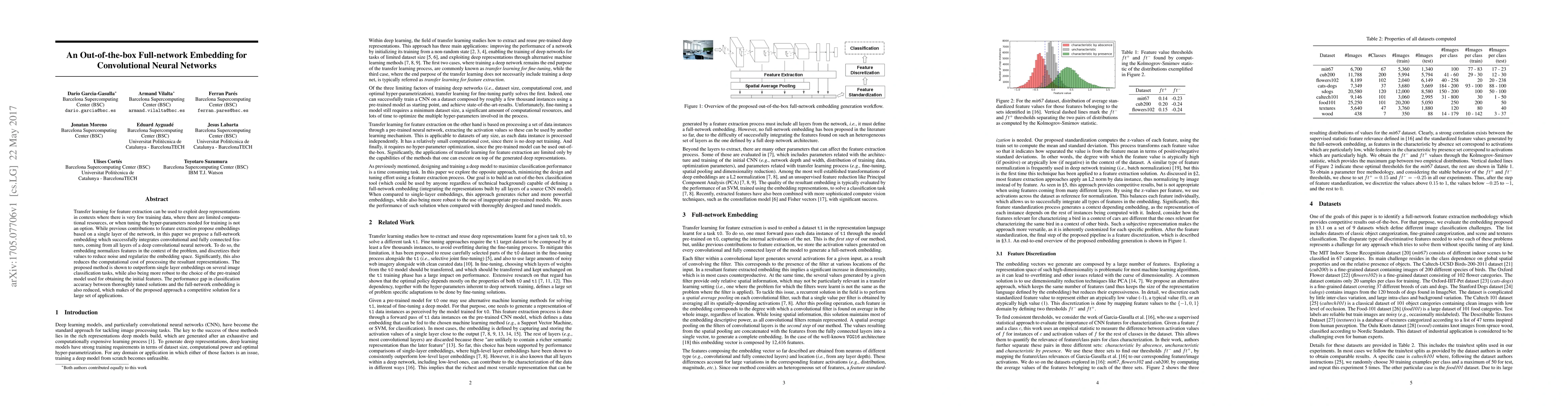 Transfer learning for feature extraction can be used to exploit deep representations in contexts where there is very few training data, where there are limited computational resources, or when tuning the hyper-parameters needed for training is not an option. While previous contributions to feature extraction propose embeddings based on a single layer of the network, in this paper we propose a full-network embedding which successfully integrates convolutional and fully connected features, coming from all layers of a deep convolutional neural network. To do so, the embedding normalizes features in the context of the problem, and discretizes their values to reduce noise and regularize the embedding space. Significantly, this also reduces the computational cost of processing the resultant representations. The proposed method is shown to outperform single layer embeddings on several image classification tasks, while also being more robust to the choice of the pre-trained model used for obtaining the initial features. The performance gap in classification accuracy between thoroughly tuned solutions and the full-network embedding is also reduced, which makes of the proposed approach a competitive solution for a large set of applications.