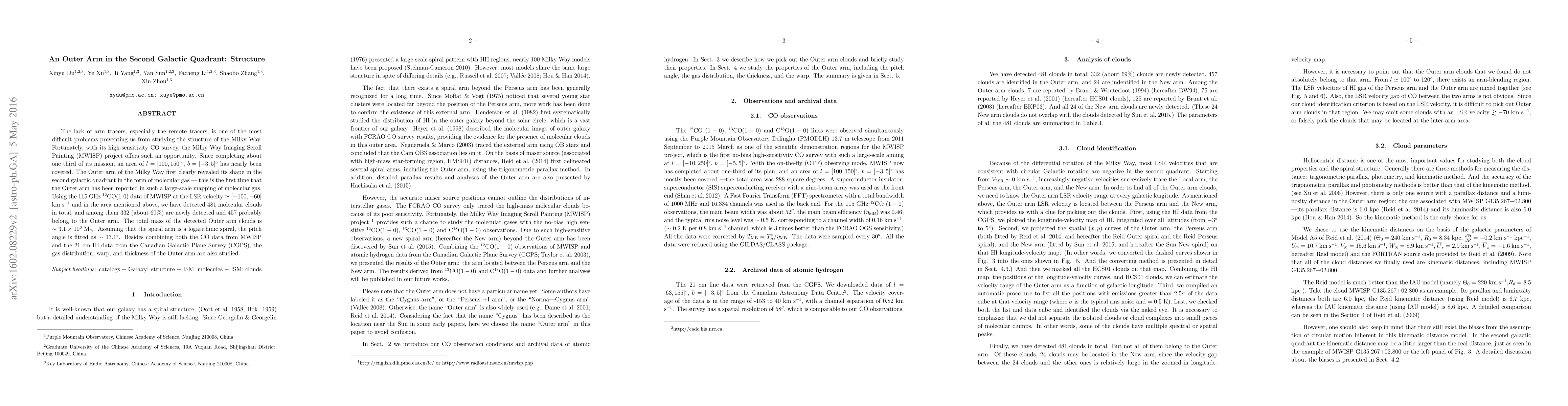 This paper reports the first large-scale mapping of the Outer arm of the Milky Way in the second galactic quadrant using high-sensitivity CO survey data from the MWISP project. The study detected 481 molecular clouds, with 332 newly identified, and estimates the arm's total mass at ~3.1*10^6 M_sun.