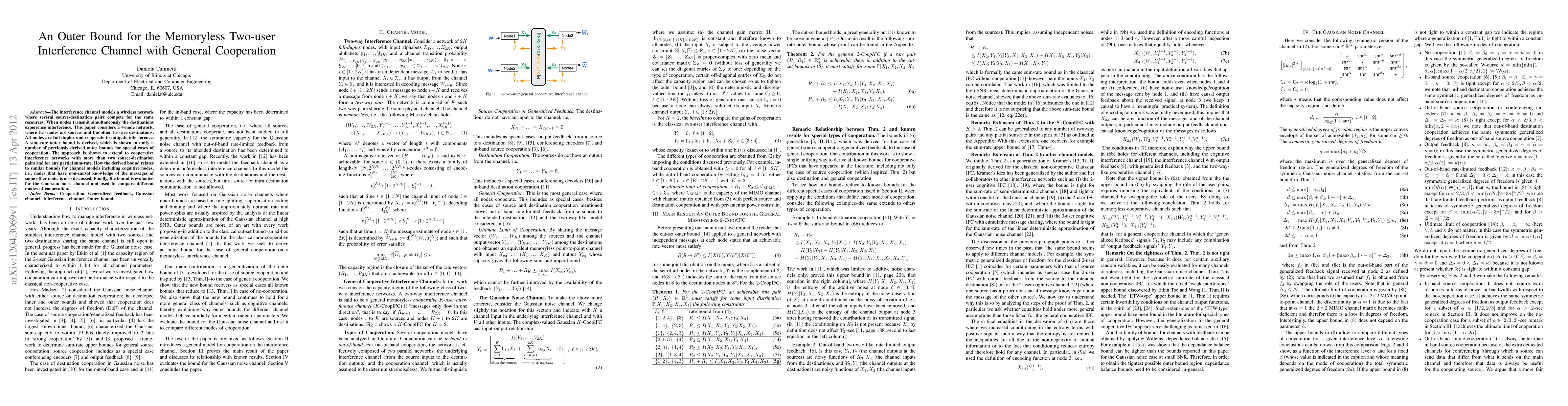 Researchers derived a general outer bound for the memoryless two-user interference channel with cooperation in a 4-node network, unifying previously derived bounds for special cases. The approach can be extended to networks with more than two pairs and partial sum-rates.