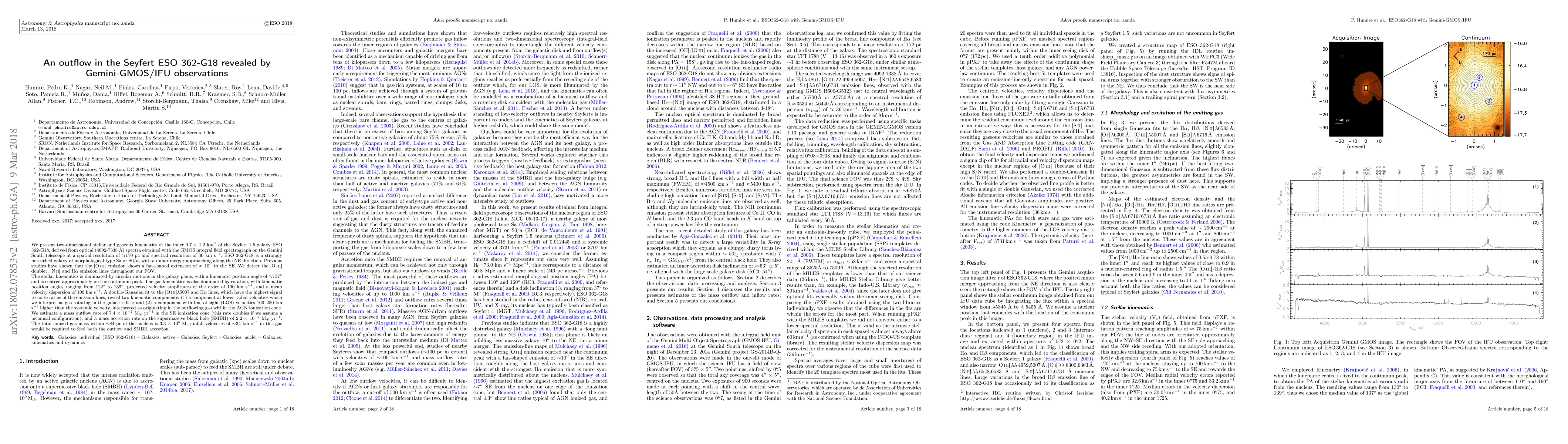 We present two-dimensional stellar and gaseous kinematics of the inner 0.7 $\times$ 1.2 kpc$^{2}$ of the Seyfert galaxy ESO 362-G18, derived from optical spectra obtained with the GMOS/IFU on the Gemini South telescope at a spatial resolution of $\approx$170 pc and spectral resolution of 36 km s$^{-1}$. ESO 362-G18 is a strongly perturbed galaxy of morphological type Sa or S0/a, with a minor merger approaching along the NE direction. Previous studies have shown that the [OIII] emission shows a fan-shaped extension of $\approx$ 10\arcsec\ to the SE. We detect the [OIII] doublet, [NII] and H${\alpha}$ emission lines throughout our field of view. The stellar kinematics is dominated by circular motions in the galaxy plane, with a kinematic position angle of $\approx$137$^{\circ}$. The gas kinematics is also dominated by rotation, with kinematic position angles ranging from 122$^{\circ}$ to 139$^{\circ}$. A double-Gaussian fit to the [OIII]$\lambda$5007 and H${\alpha}$ lines, which have the highest signal to noise ratios of the emission lines, reveal two kinematic components: (1) a component at lower radial velocities which we interpret as gas rotating in the galactic disk; and (2) a component with line of sight velocities 100-250 km s$^{-1}$ higher than the systemic velocity, interpreted as originating in the outflowing gas within the AGN ionization cone. We estimate a mass outflow rate of 7.4 $\times$ 10$^{-2}$ M$_{\odot}$ yr$^{-1}$ in the SE ionization cone (this rate doubles if we assume a biconical configuration), and a mass accretion rate on the supermassive black hole (SMBH) of 2.2 $\times$ 10$^{-2}$ M$_{\odot}$ yr$^{-1}$. The total ionized gas mass within $\sim$84 pc of the nucleus is 3.3 $\times$ 10$^{5}$ M$_{\odot}$; infall velocities of $\sim$34 km s$^{-1}$ in this gas would be required to feed both the outflow and SMBH accretion.