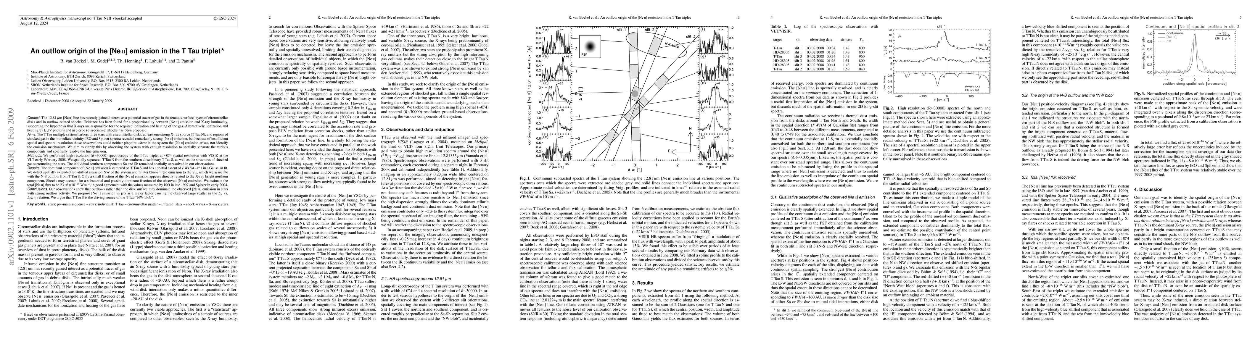 (Note: this is a shortened version of the original "structured" (A&A format) abstract.) The 12.81 micrometer [NeII] line has recently gained interest as a potential tracer of gas in the tenuous surface layers of circumstellar disks. The line has been detected using the Spitzer Space Telescope in many young stars, yet these observations neiter spatially nor spectrally resolve the [NeII emission, leaving the nature of the emission mechanism unclear. Both an origin in an X-ray irradiated disk surface and an origin in strong, dissociative shocks have been proposed. We have performed a high spatial and spectral resolution (0.4 arcsec, R=30000) study of the T Tau triplet. This system contains three young stars with disks, at least one strong X-ray source (T Tau N), and diffuse regions of shocked gas surrounding the system on a scale of a few arcseconds. We find that the dominant component of [NeII] emission is centered on T Tau S and has a spatial extent of approximately 1.1 arcseconds, which is much larger than the disks in T Tau S. We detect spatially extended red-shifted emission NW of the system and fainter blue-shifted emission to the SE, which we associate with the N-S outflow from T Tau S. Only a small fraction of the [NeII] emission appears to be directly related to the X-ray bright northern component. We propose [NeII] emission in jets as a major factor causing the observed large scatter in the X-ray luminosity vs. [NeII] luminosity relation. We argue that T Tau S is the driving source of the T Tau "NW-blob"