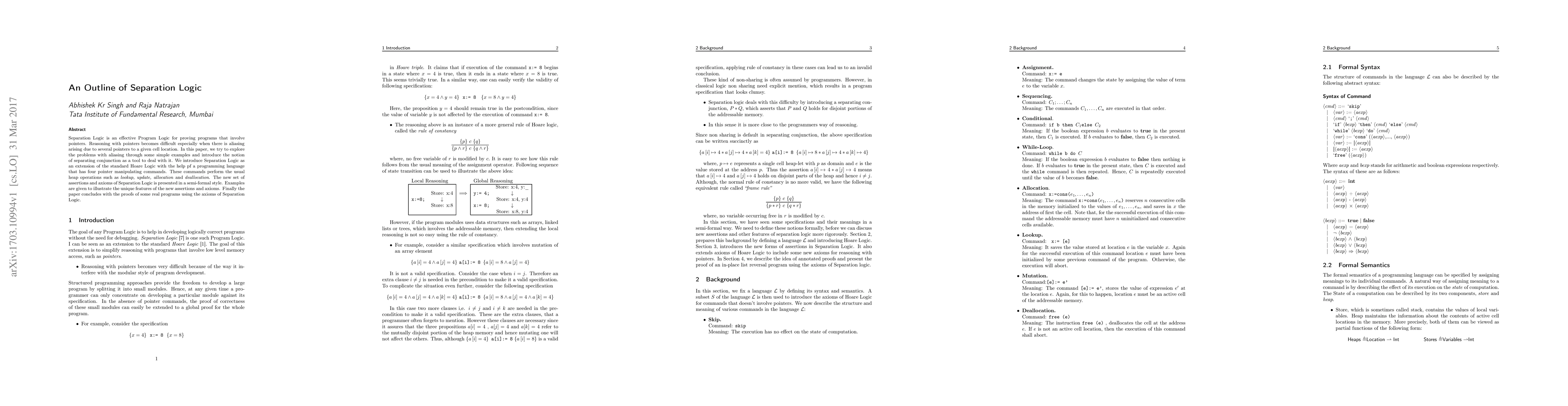 Separation Logic is an effective Program Logic for proving programs that involve pointers. Reasoning with pointers becomes difficult especially when there is aliasing arising due to several pointers to a given cell location. In this paper, we try to explore the problems with aliasing through some simple examples and introduce the notion of separating conjunction as a tool to deal with it. We introduce Separation Logic as an extension of the standard Hoare Logic with the help pf a programming language that has four pointer manipulating commands. These commands perform the usual heap operations such as lookup, update, allocation and deallocation. The new set of assertions and axioms of Separation Logic is presented in a semi-formal style. Examples are given to illustrate the unique features of the new assertions and axioms. Finally the paper concludes with the proofs of some real programs using the axioms of Separation Logic.