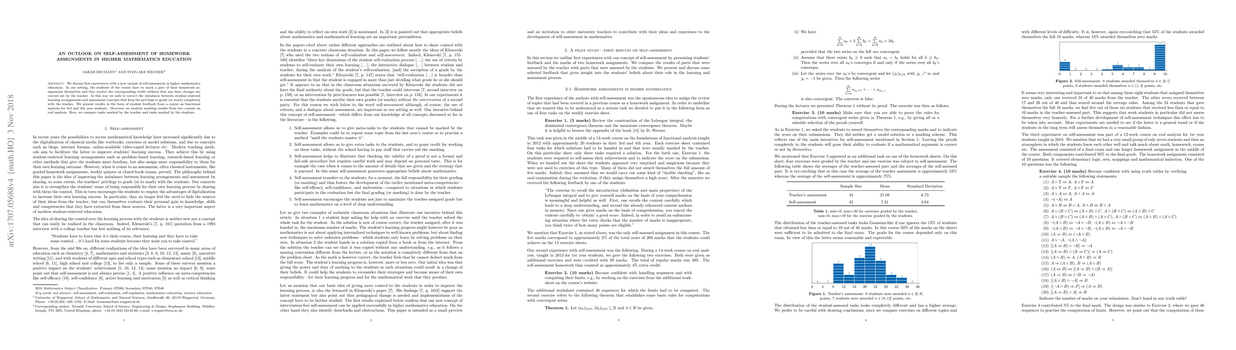 This paper explores a new self-assessment method in higher mathematics education where students grade part of their homework, receiving credit without teacher intervention. Initial feedback from students and comparative analysis of student-marked versus teacher-marked tasks in functional analysis and real analysis courses indicate promising outcomes in balancing student-centered learning with assessment.
