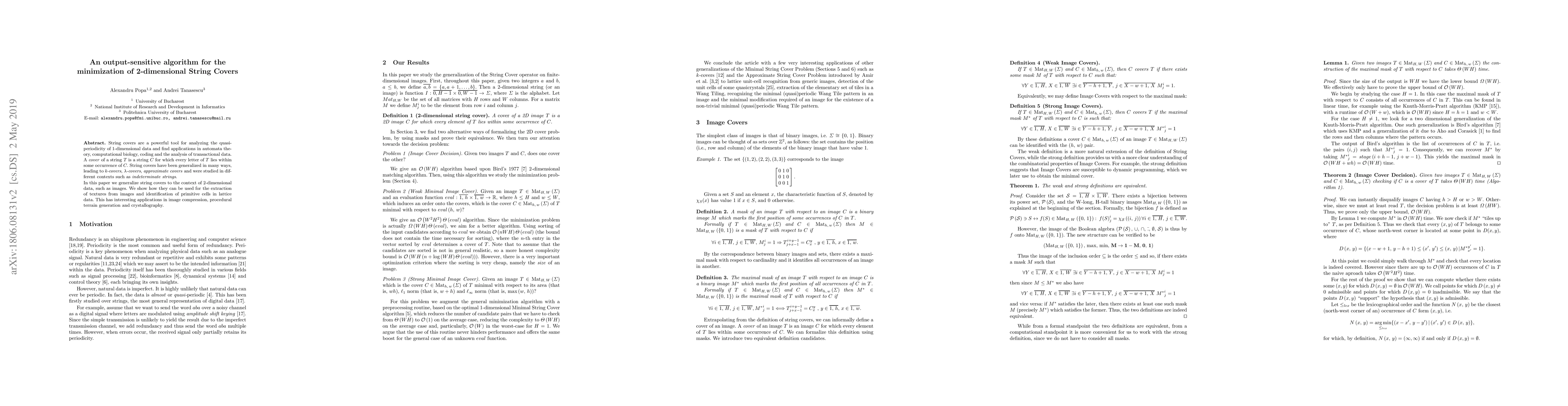 String covers are a powerful tool for analyzing the quasi-periodicity of 1-dimensional data and find applications in automata theory, computational biology, coding and the analysis of transactional data. A \emph{cover} of a string $T$ is a string $C$ for which every letter of $T$ lies within some occurrence of $C$. String covers have been generalized in many ways, leading to \emph{k-covers}, \emph{$\lambda$-covers}, \emph{approximate covers} and were studied in different contexts such as \emph{indeterminate strings}. In this paper we generalize string covers to the context of 2-dimensional data, such as images. We show how they can be used for the extraction of textures from images and identification of primitive cells in lattice data. This has interesting applications in image compression, procedural terrain generation and crystallography.