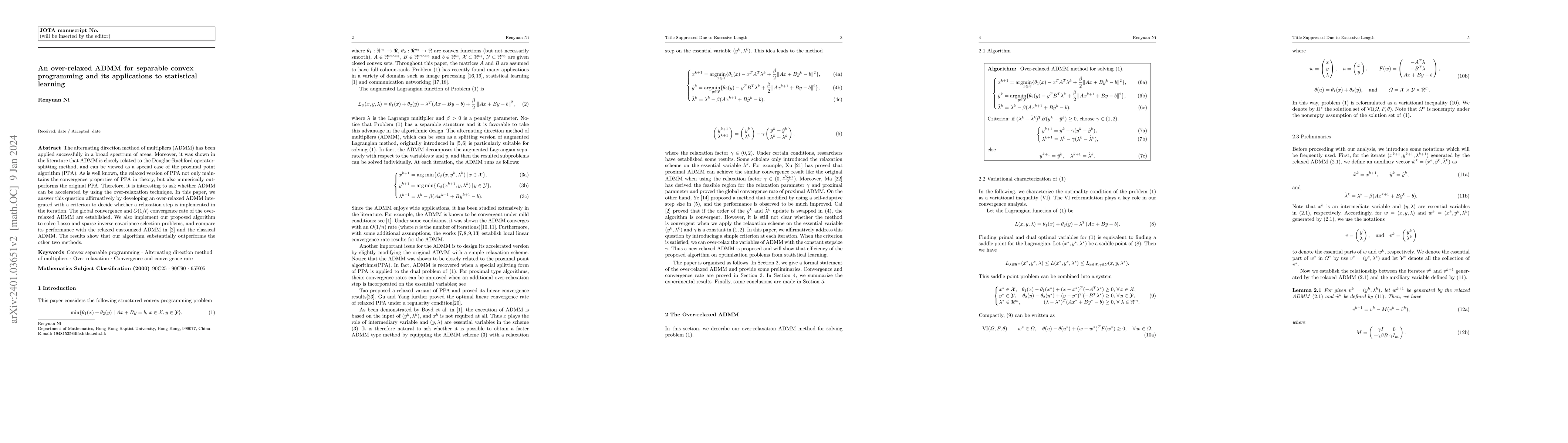 This paper develops an over-relaxed version of the ADMM for separable convex programming, establishing its global convergence and $O(1/t)$ convergence rate. The proposed method outperforms classical ADMM and a relaxed customized ADMM in solving Lasso and sparse inverse covariance selection problems.