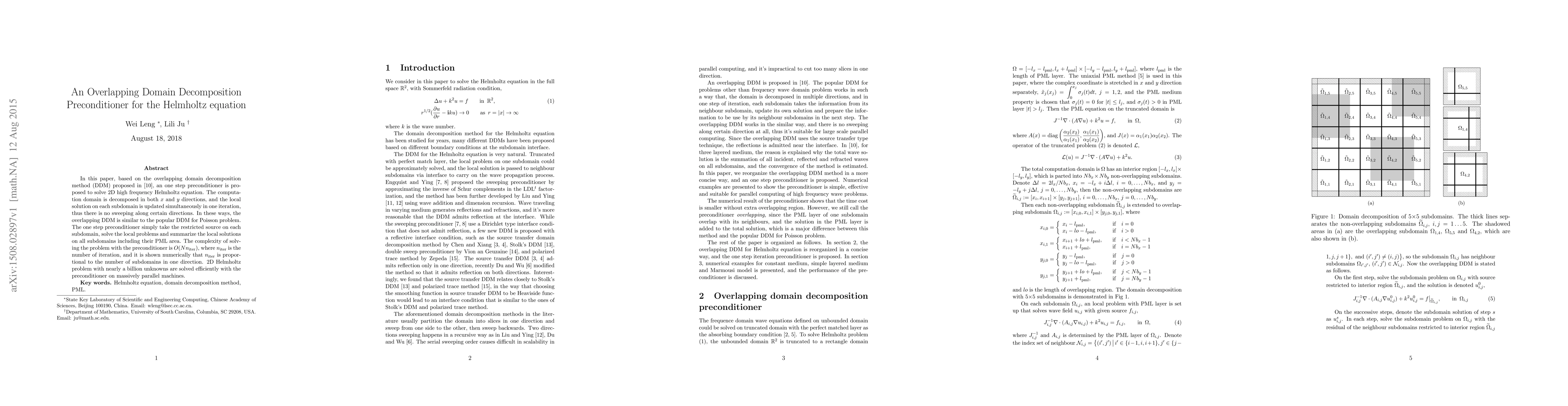 In this paper, based on the overlapping domain decomposition method (DDM) proposed in \cite{Leng2015}, an one step preconditioner is proposed to solve 2D high frequency Helmholtz equation. The computation domain is decomposed in both $x$ and $y$ directions, and the local solution on each subdomain is updated simultaneously in one iteration, thus there is no sweeping along certain directions. In these ways, the overlapping DDM is similar to the popular DDM for Poisson problem. The one step preconditioner simply take the restricted source on each subdomain, solve the local problems and summarize the local solutions on all subdomains including their PML area. The complexity of solving the problem with the preconditioner is $O(N n_{\text{iter}})$, where $n_{\text{iter}}$ is the number of iteration, and it is shown numerically that $n_{\text{iter}}$ is proportional to the number of subdomains in one direction. 2D Helmholtz problem with nearly a billion unknowns are solved efficiently with the preconditioner on massively parallel machines.