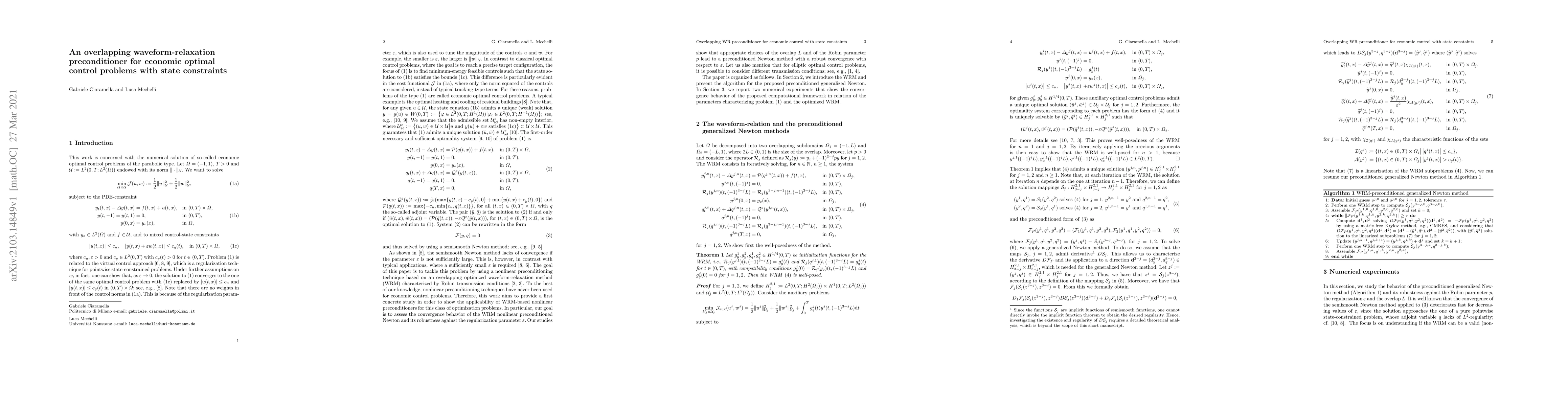 This paper introduces an overlapping waveform-relaxation preconditioner for solving parabolic economic optimal control problems with state constraints. The proposed preconditioner, based on an optimized waveform-relaxation method, enhances the convergence of Newton methods, especially when the regularization parameter decreases.