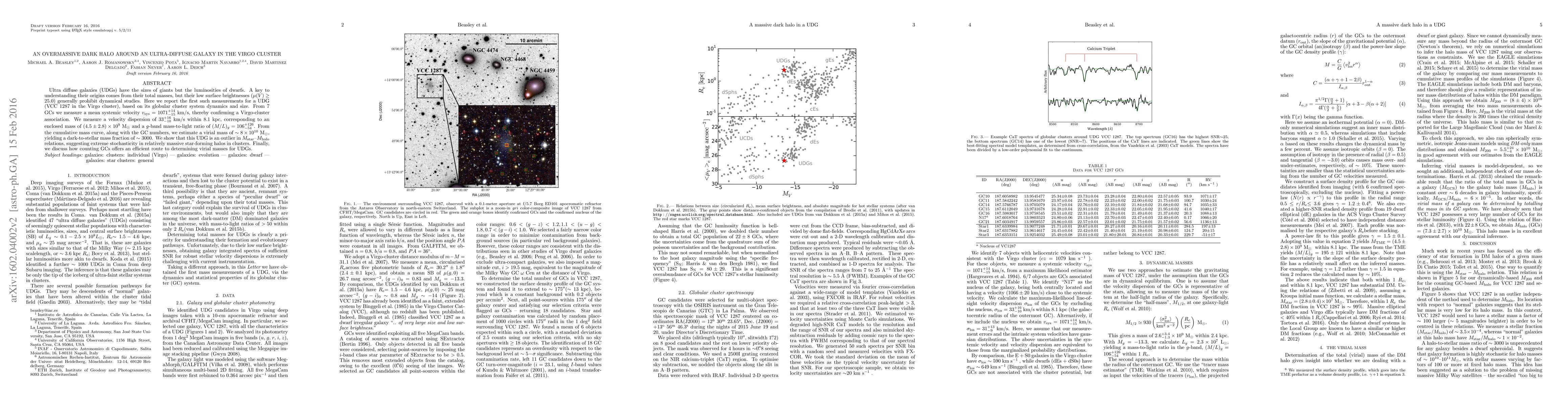 This paper reports the first dynamical mass measurements for an ultra diffuse galaxy (UDG) in the Virgo cluster, revealing an overmassive dark halo with a virial mass of $\sim8\times10^{10}$ $M_{\odot}$, indicating a dark-to-stellar mass fraction of $\sim3000$ and suggesting extreme variations in star-forming halos. The study uses globular cluster dynamics and counts to estimate these masses.