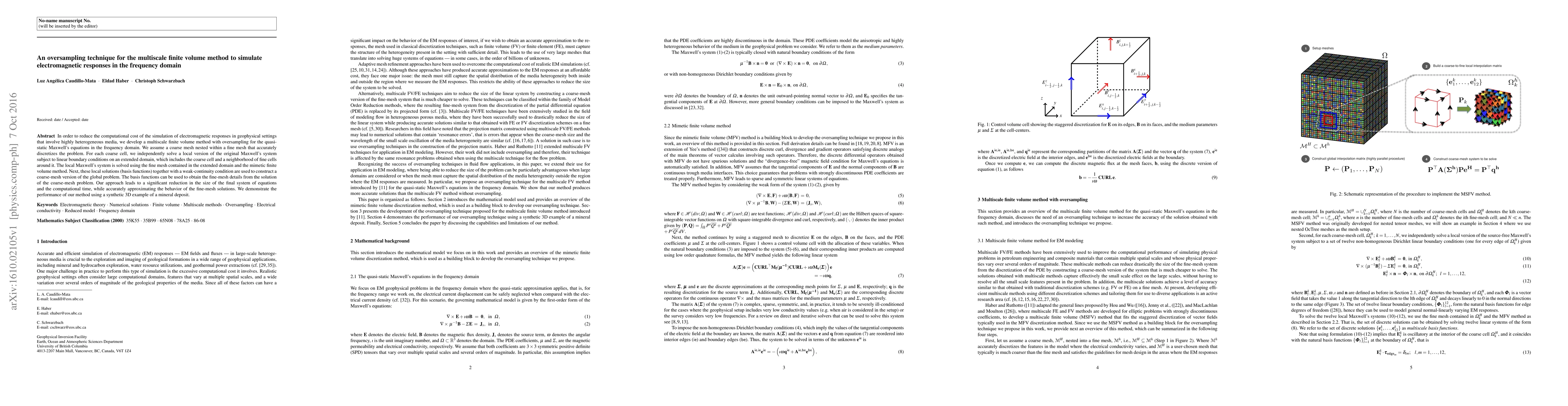 This paper proposes a multiscale finite volume method with oversampling to reduce computational costs for simulating electromagnetic responses in heterogeneous geophysical media. The method uses a coarse mesh with fine mesh oversampling to solve local Maxwell's equations, leading to significant reductions in computational time and system size while accurately approximating fine-mesh details.