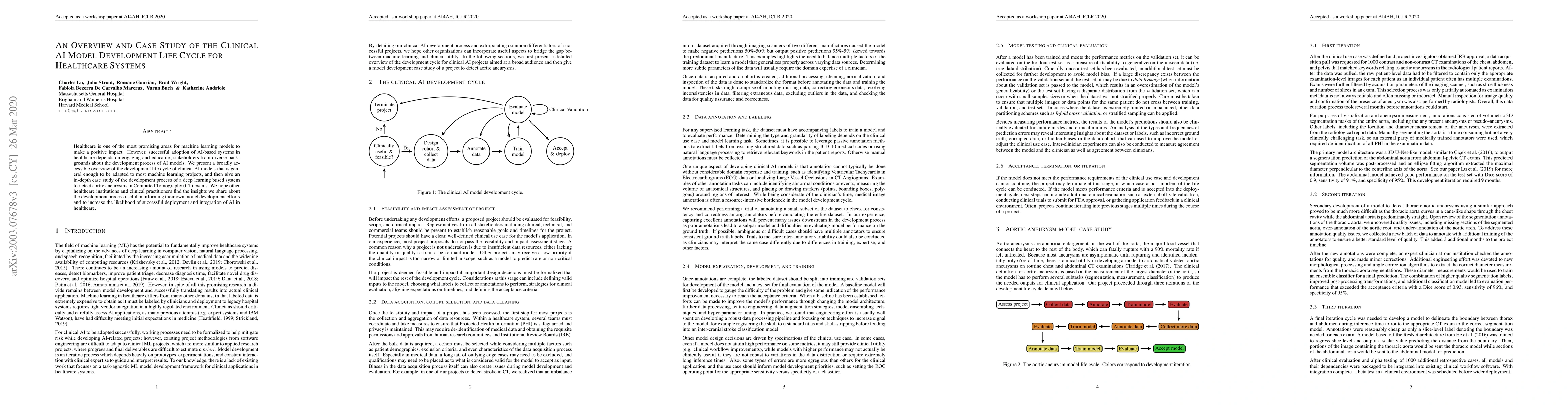 Healthcare is one of the most promising areas for machine learning models to make a positive impact. However, successful adoption of AI-based systems in healthcare depends on engaging and educating stakeholders from diverse backgrounds about the development process of AI models. We present a broadly accessible overview of the development life cycle of clinical AI models that is general enough to be adapted to most machine learning projects, and then give an in-depth case study of the development process of a deep learning based system to detect aortic aneurysms in Computed Tomography (CT) exams. We hope other healthcare institutions and clinical practitioners find the insights we share about the development process useful in informing their own model development efforts and to increase the likelihood of successful deployment and integration of AI in healthcare.