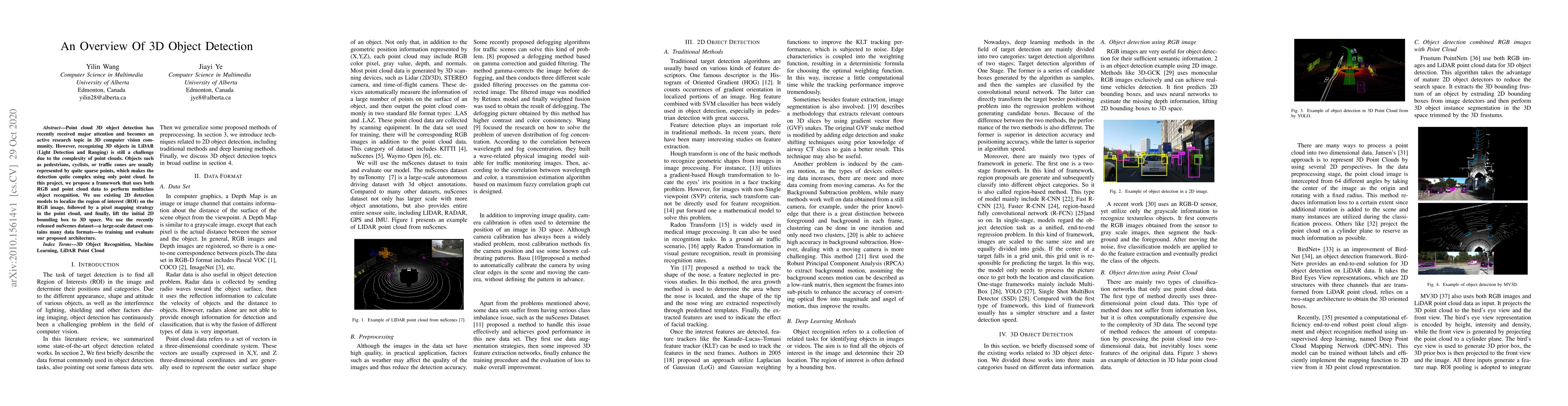 This paper proposes a framework for 3D object detection using both RGB and point cloud data to recognize multiclass objects in LiDAR scans. It uses existing 2D detection models and achieves promising results on the nuScenes dataset.