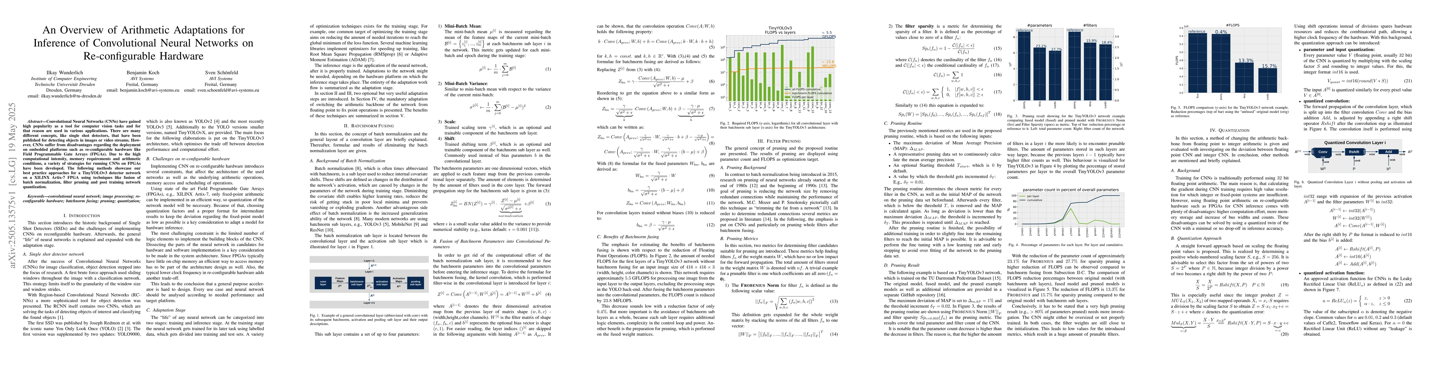 The paper contributes practical methods for adapting CNN arithmetic to suit FPGA inference, including batch norm fusion, filter pruning, and quantization.