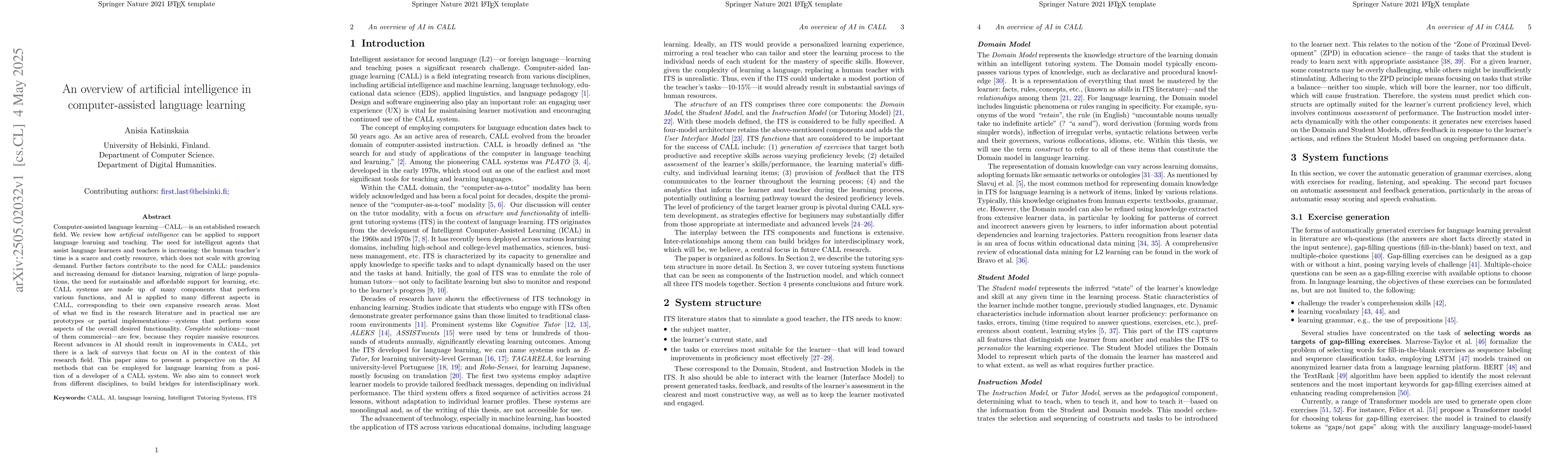 Computer-assisted language learning -- CALL -- is an established research field. We review how artificial intelligence can be applied to support language learning and teaching. The need for intelligent agents that assist language learners and teachers is increasing: the human teacher's time is a scarce and costly resource, which does not scale with growing demand. Further factors contribute to the need for CALL: pandemics and increasing demand for distance learning, migration of large populations, the need for sustainable and affordable support for learning, etc. CALL systems are made up of many components that perform various functions, and AI is applied to many different aspects in CALL, corresponding to their own expansive research areas. Most of what we find in the research literature and in practical use are prototypes or partial implementations -- systems that perform some aspects of the overall desired functionality. Complete solutions -- most of them commercial -- are few, because they require massive resources. Recent advances in AI should result in improvements in CALL, yet there is a lack of surveys that focus on AI in the context of this research field. This paper aims to present a perspective on the AI methods that can be employed for language learning from a position of a developer of a CALL system. We also aim to connect work from different disciplines, to build bridges for interdisciplinary work.