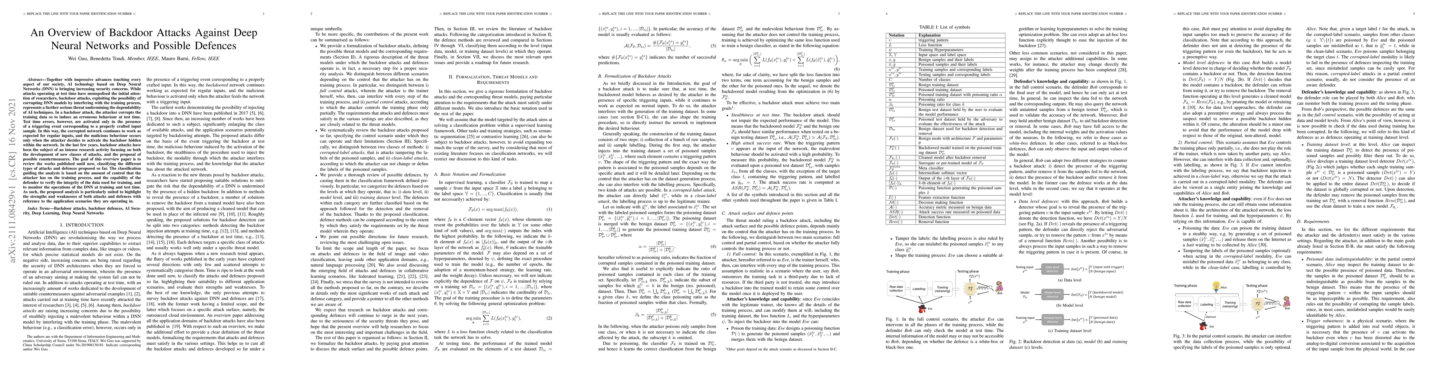 Together with impressive advances touching every aspect of our society, AI technology based on Deep Neural Networks (DNN) is bringing increasing security concerns. While attacks operating at test time have monopolised the initial attention of researchers, backdoor attacks, exploiting the possibility of corrupting DNN models by interfering with the training process, represents a further serious threat undermining the dependability of AI techniques. In a backdoor attack, the attacker corrupts the training data so to induce an erroneous behaviour at test time. Test time errors, however, are activated only in the presence of a triggering event corresponding to a properly crafted input sample. In this way, the corrupted network continues to work as expected for regular inputs, and the malicious behaviour occurs only when the attacker decides to activate the backdoor hidden within the network. In the last few years, backdoor attacks have been the subject of an intense research activity focusing on both the development of new classes of attacks, and the proposal of possible countermeasures. The goal of this overview paper is to review the works published until now, classifying the different types of attacks and defences proposed so far. The classification guiding the analysis is based on the amount of control that the attacker has on the training process, and the capability of the defender to verify the integrity of the data used for training, and to monitor the operations of the DNN at training and test time. As such, the proposed analysis is particularly suited to highlight the strengths and weaknesses of both attacks and defences with reference to the application scenarios they are operating in.