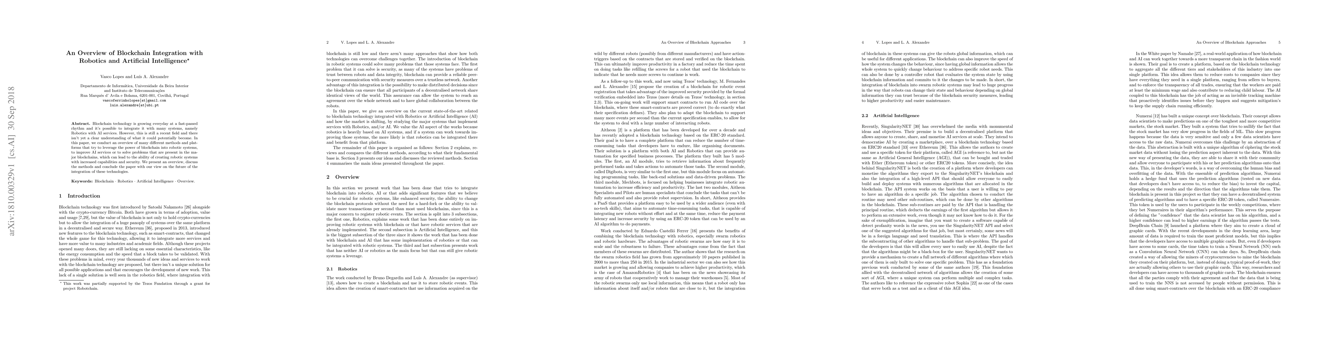 Blockchain technology is growing everyday at a fast-passed rhythm and it's possible to integrate it with many systems, namely Robotics with AI services. However, this is still a recent field and there isn't yet a clear understanding of what it could potentially become. In this paper, we conduct an overview of many different methods and platforms that try to leverage the power of blockchain into robotic systems, to improve AI services or to solve problems that are present in the major blockchains, which can lead to the ability of creating robotic systems with increased capabilities and security. We present an overview, discuss the methods and conclude the paper with our view on the future of the integration of these technologies.