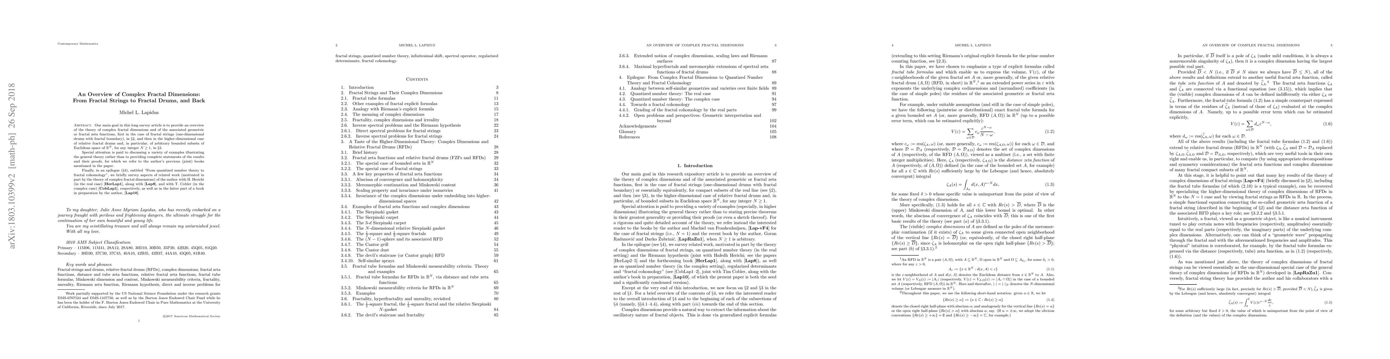 This paper provides an overview of complex fractal dimensions, focusing on fractal strings and higher-dimensional fractal drums, and includes examples to illustrate the general theory. An epilogue discusses related work in quantized number theory and fractal cohomology.