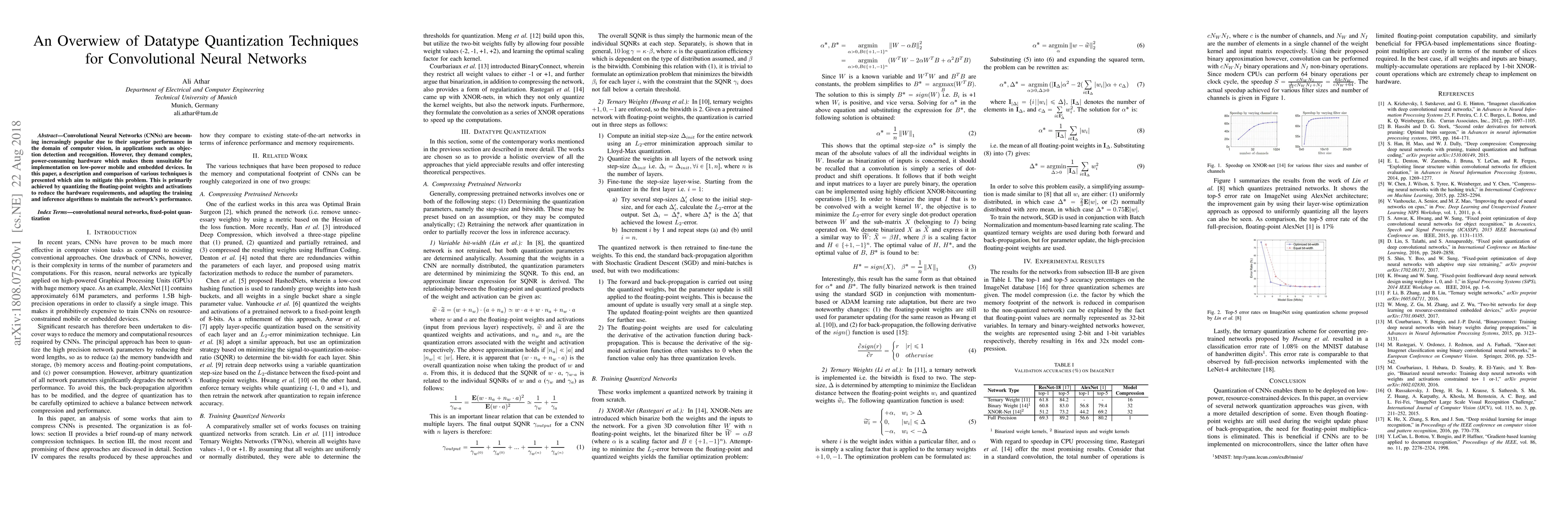 Convolutional Neural Networks (CNNs) are becoming increasingly popular due to their superior performance in the domain of computer vision, in applications such as objection detection and recognition. However, they demand complex, power-consuming hardware which makes them unsuitable for implementation on low-power mobile and embedded devices. In this paper, a description and comparison of various techniques is presented which aim to mitigate this problem. This is primarily achieved by quantizing the floating-point weights and activations to reduce the hardware requirements, and adapting the training and inference algorithms to maintain the network's performance.