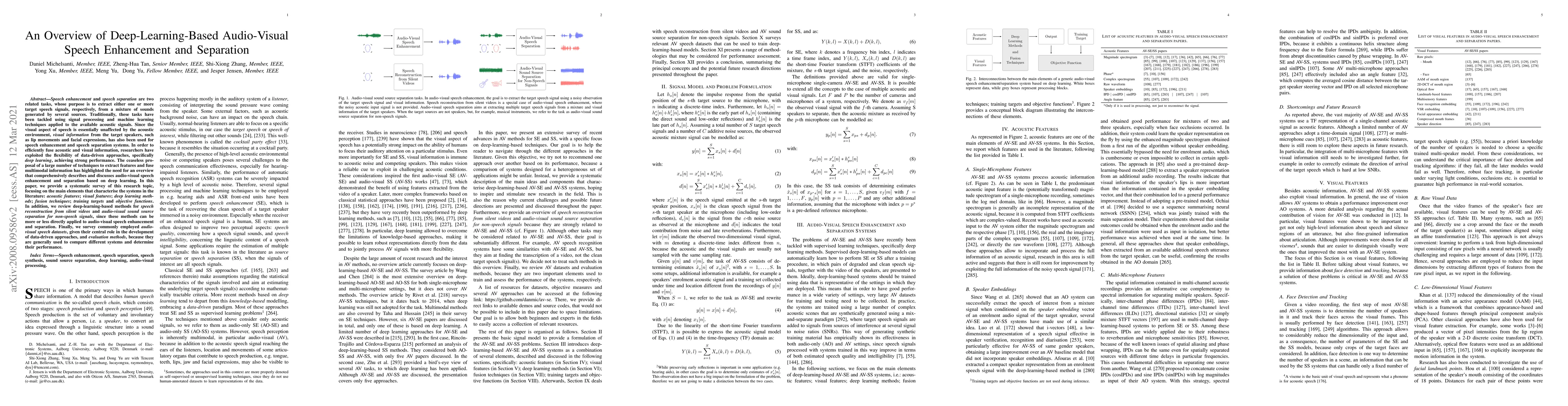 This paper provides a comprehensive survey of deep-learning-based techniques for audio-visual speech enhancement and separation, focusing on acoustic and visual features, deep learning methods, fusion techniques, and evaluation metrics. It also reviews related methods for speech reconstruction and sound source separation.