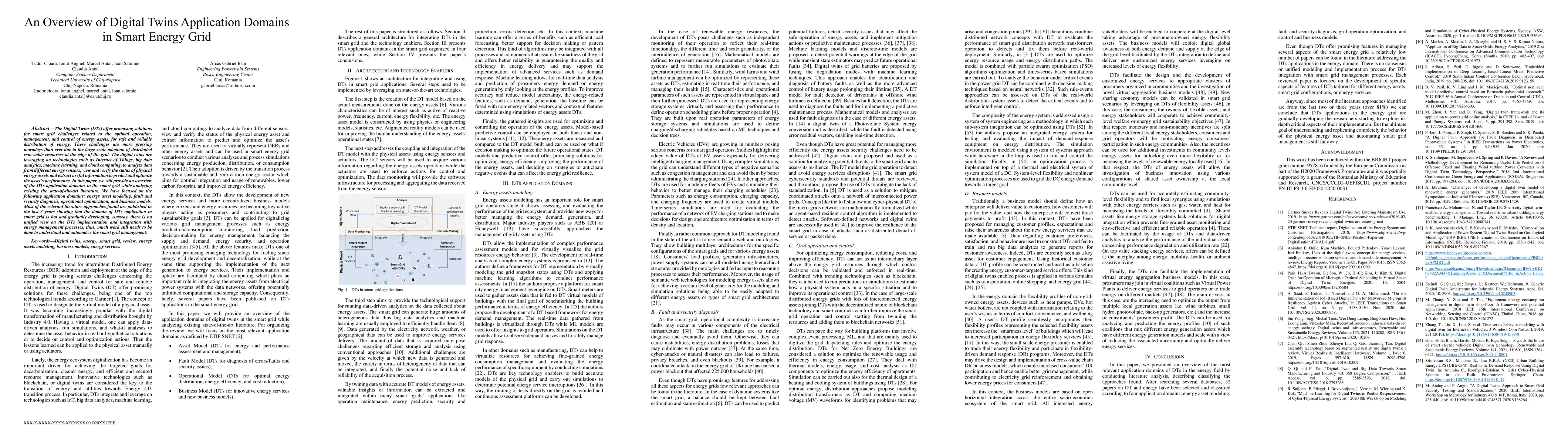 This paper provides an overview of Digital Twins applications in smart grid domains, focusing on energy asset modeling, fault and security diagnosis, operational optimization, and business models. It highlights the integration of IoT, big data, and machine learning to enhance grid management, though it notes a lack of unified implementation strategies.