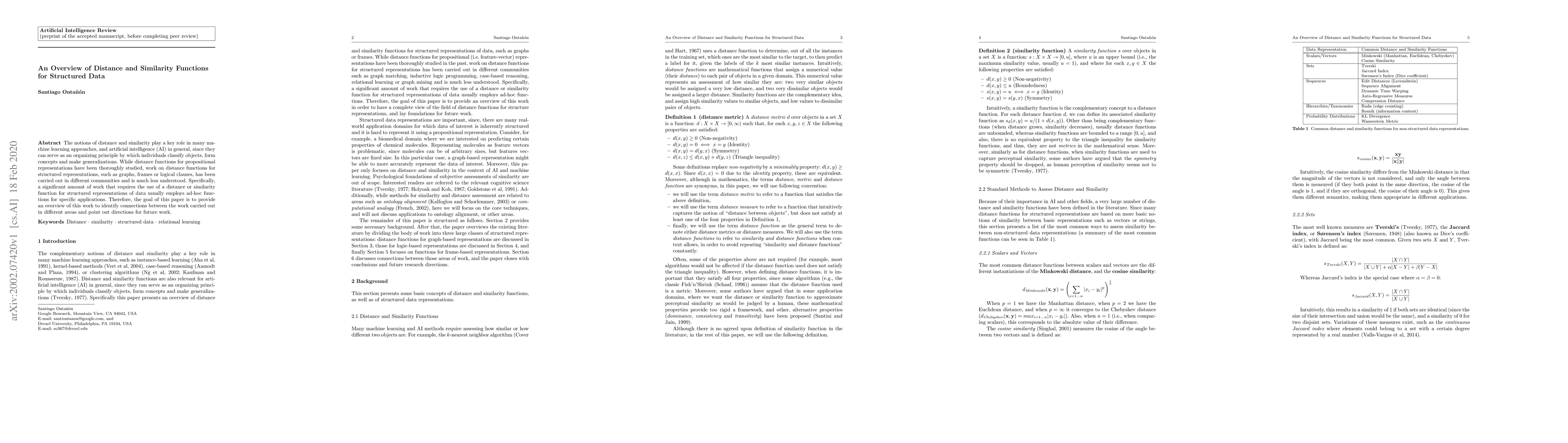 The notions of distance and similarity play a key role in many machine learning approaches, and artificial intelligence (AI) in general, since they can serve as an organizing principle by which individuals classify objects, form concepts and make generalizations. While distance functions for propositional representations have been thoroughly studied, work on distance functions for structured representations, such as graphs, frames or logical clauses, has been carried out in different communities and is much less understood. Specifically, a significant amount of work that requires the use of a distance or similarity function for structured representations of data usually employs ad-hoc functions for specific applications. Therefore, the goal of this paper is to provide an overview of this work to identify connections between the work carried out in different areas and point out directions for future work.