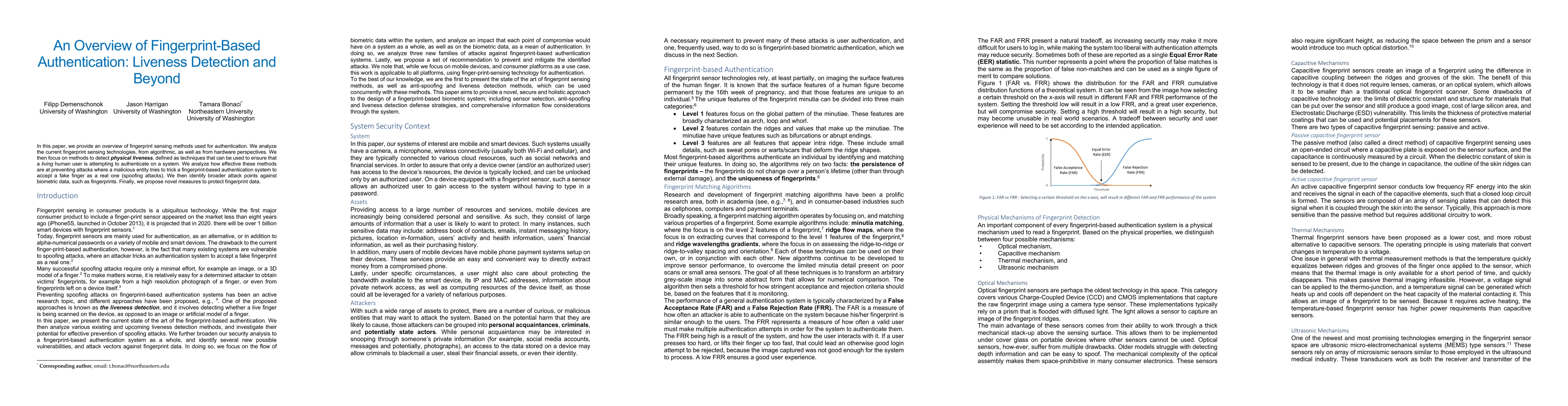 This paper reviews fingerprint sensing technologies for authentication, emphasizing liveness detection methods to prevent spoofing attacks. It also explores broader vulnerabilities in biometric data and proposes new protective measures.