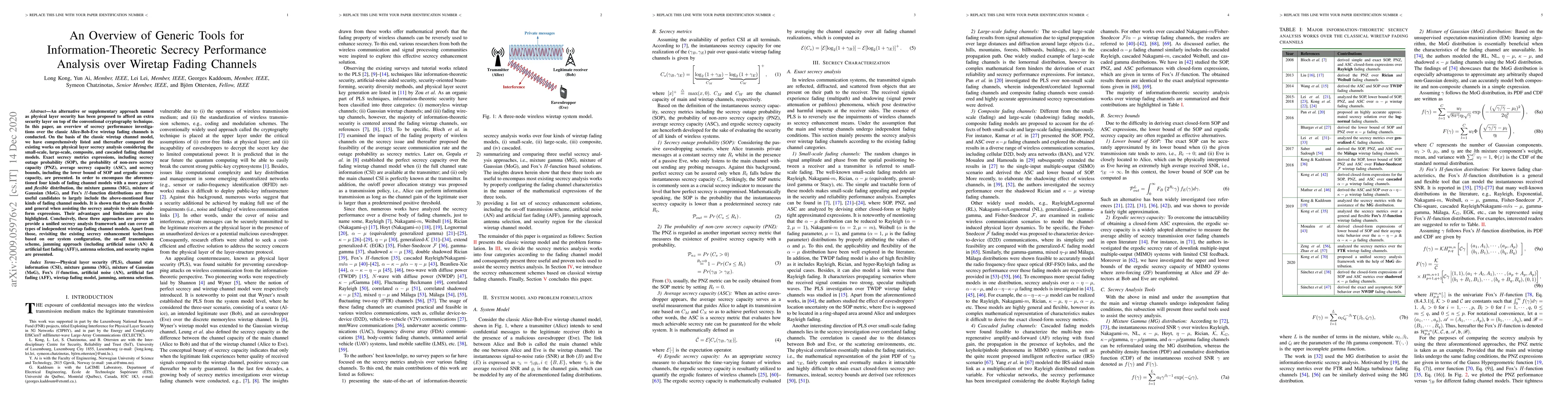 This paper provides an overview of physical layer security techniques for secrecy performance analysis over various wiretap fading channels, including small-scale, large-scale, composite, and cascaded models. It discusses the use of mixture gamma, mixture of Gaussian, and Fox's $H$-function distributions to achieve a unified analysis framework, alongside reviewing existing secrecy enhancement methods like on-off transmission and jamming.